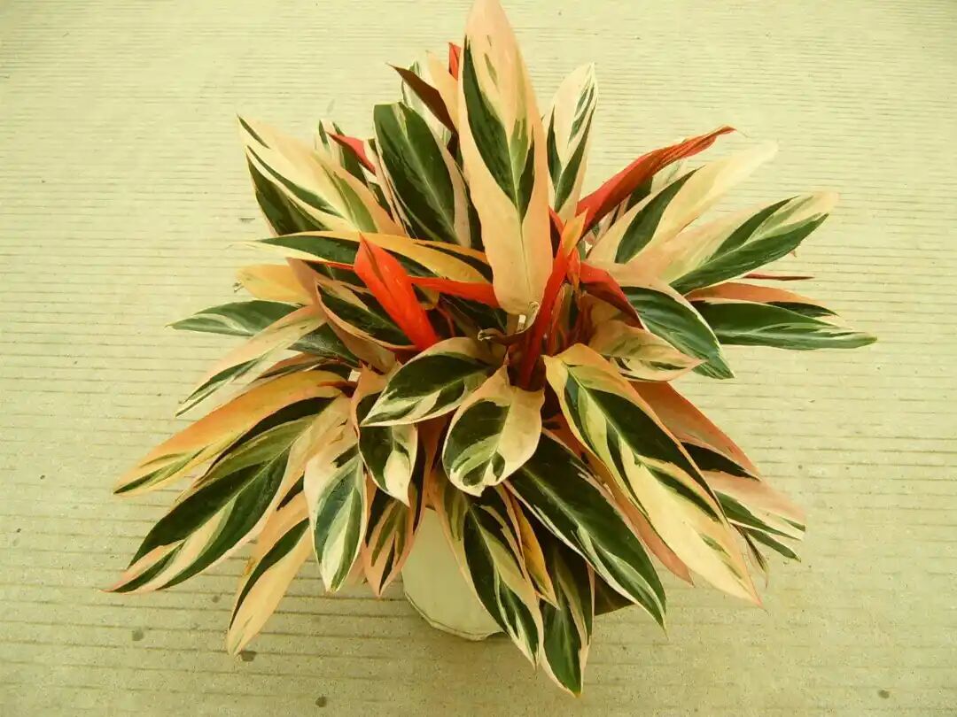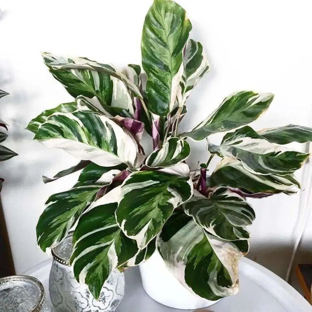 The leaves of Arrowroot variegated are oblong, large and thin, with purple-red leaf backs and zebra stripes, which is the origin of its name Arrowroot variegated.