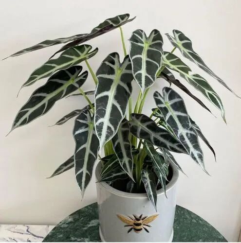 The leaves of Arrowroot angel are wide, layered in color, with a circle of white markings on the leaf edge, and dark green in the center of the leaves. If it is properly maintained, the main veins will appear red.
