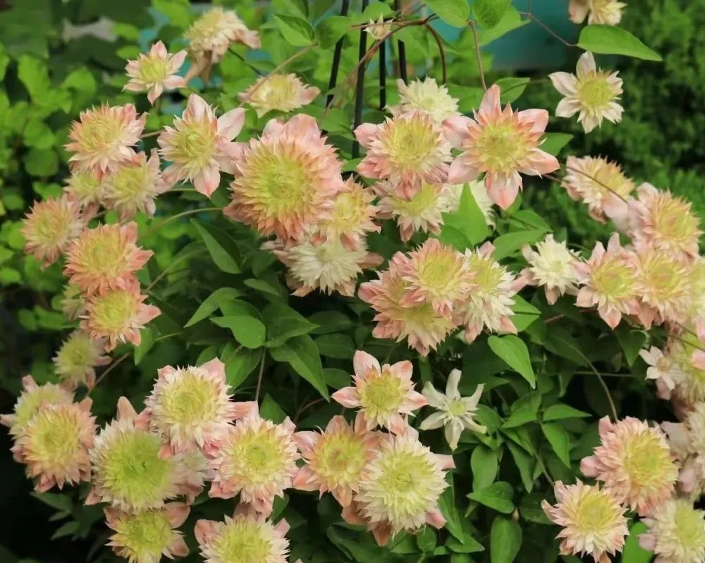 Domestic flower lovers generally call green jade "little green", It is particularly tolerant to shade in the clematis family , strong climbing ability (plant 2-3 m), round and lovely flowers (double petals in old branches and single petals in new branches), flower diameter 7-10 cm, flower color is special green (green with white to be precise), fresh and refined, with a strong pastoral style.