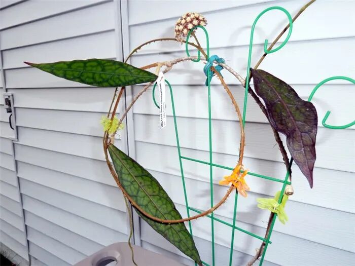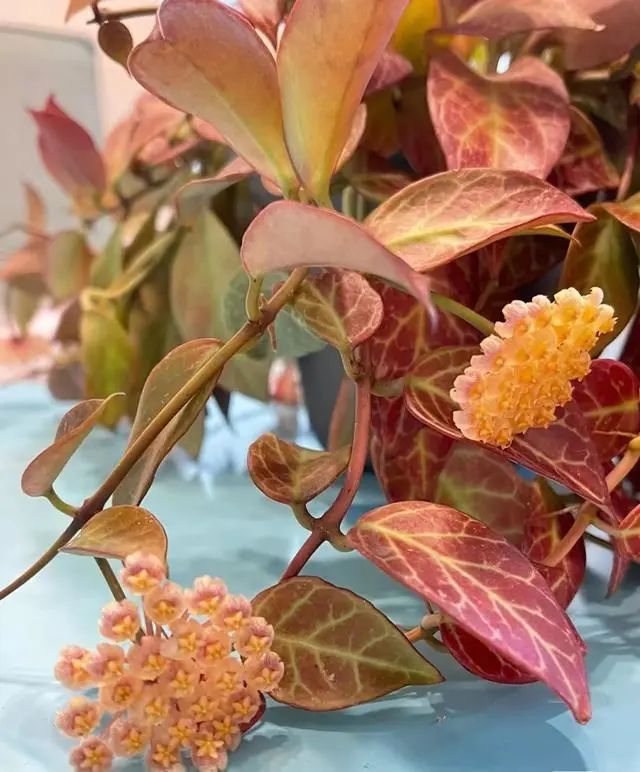 The unique features of Nearly Related Hoya are its leaves and flower color: The leaf is Oval shape, with fluff on the dorsal strap, (old leaves are hard, new leaves are thin and wrinkled), and petals are shiny and bright (composed of red and yellow, and the two colors are excessively natural).