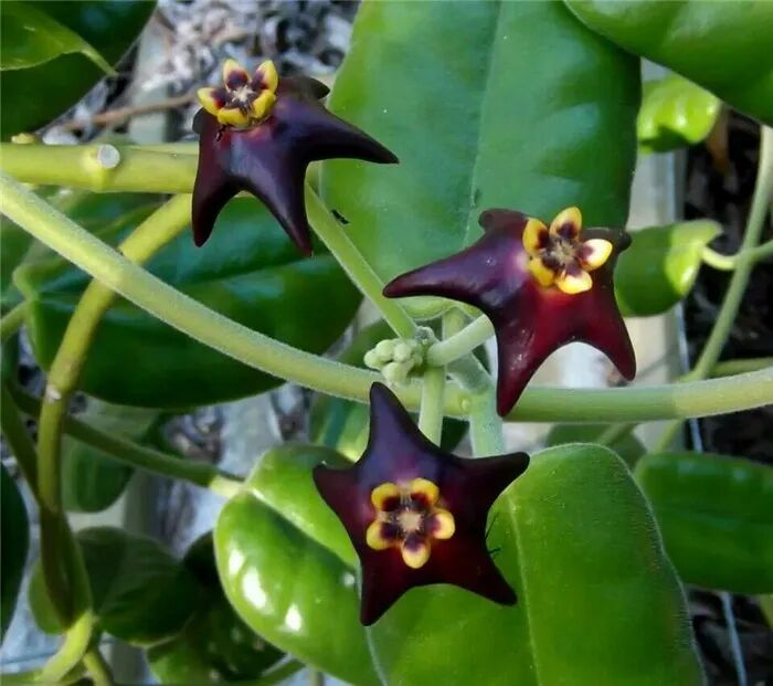The special features of Hoya ciliata are the leaves, flowers and flower colors: The leaves are large and oval, with fine villi on the edges, hence the name; The pentagram-shaped petals are curved backwards, and the flower is darker (nearly black). Hoya ciliata is not cold hardy and will only bloom at certain temperatures.