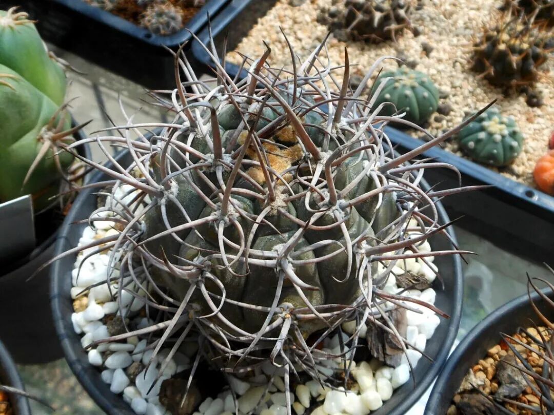 The sphere is round or flat, blue-green or dark green. Each spine seat has 3 central spines (very stout, gray pointed, inward curved) and 8-9 radial small spines.