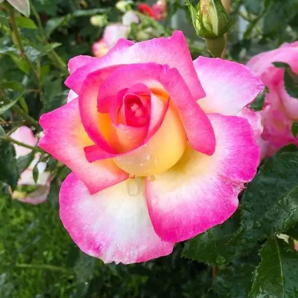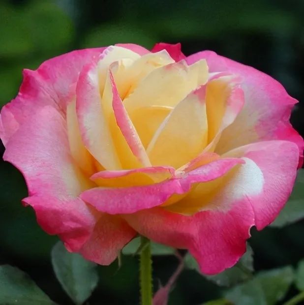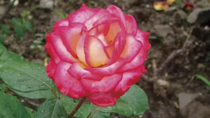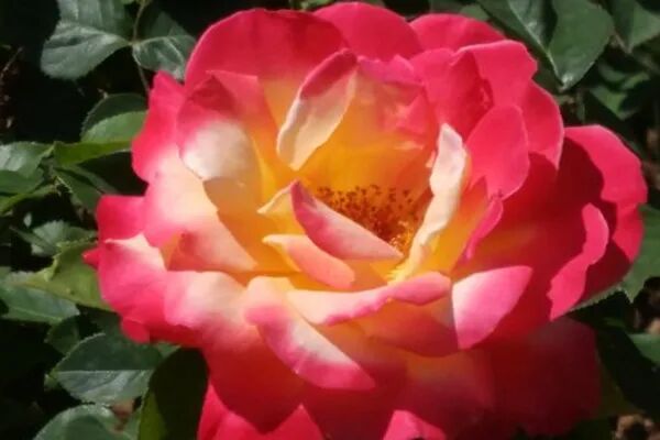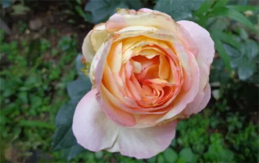 Flower diameter 12 cm, double petals (40 petals), pink and yellow mixed color, tea fragrance, repeated flowering in many seasons. The plant is about 180 cm tall.