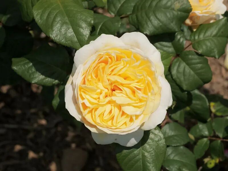Flower diameter 20 cm, double petals (26-40 petals), creamy yellow, faint sweet fragrance, repeated blooming in many seasons. The plant is about 120 cm tall.