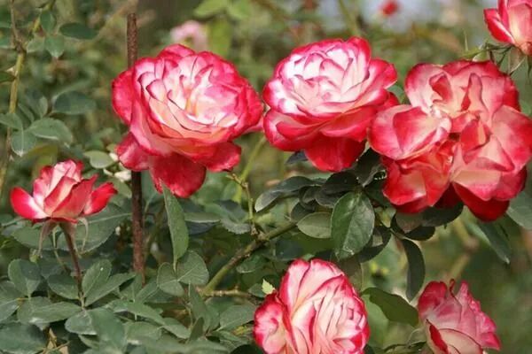 Flower diameter 14 cm, double petals (30 petals), red, white and yellow mixed colors, strong fragrance, repeated blooming in many seasons. The plant is about 90-100 cm tall.