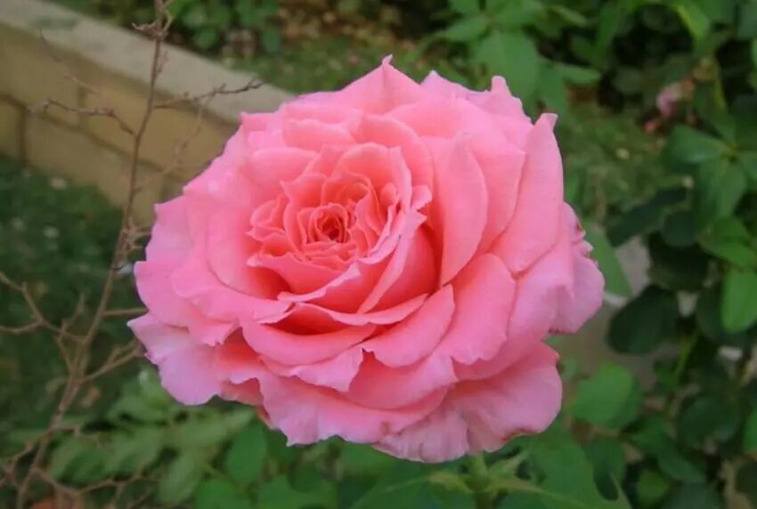Flower diameter 10 cm, double petals, salmon pink, light fragrance, repeated flowering in many seasons. The plant is about 80 cm high.
