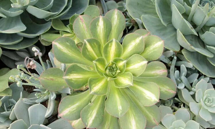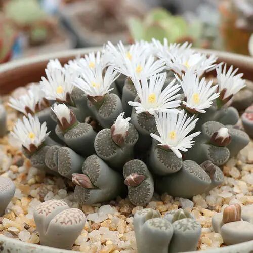 The leaf epidermis is hard, the color is changeable, and the top has dark dendritic concave lines or pattern spots. There is a crack at the top of the plant, and flowers in the crack. The flowering period is from midsummer to mid-autumn.