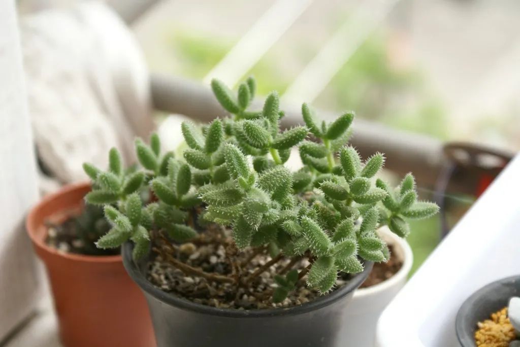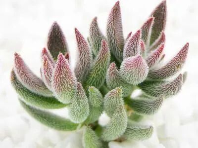 The leaves are very fleshy, the surface is covered with very small transparent glassy particles, the apex of the leaves is thickened, and the opposite arrangement resembles rabbit ears. The leaves are green and reddish in plenty of light. The old stems are light brown, and the tender stems are green, thin, and densely covered with very fine soft fluff.