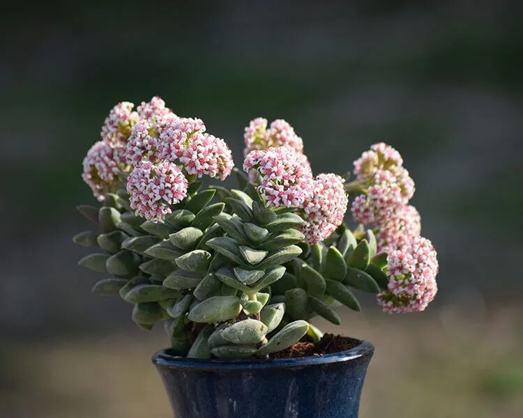 The front end of the leaves is triangular, densely opposite in pairs. The leaves are pale grayish-green to dark green. Flowering in spring, the flowers are clustered at the top, pink, large and fragrant.