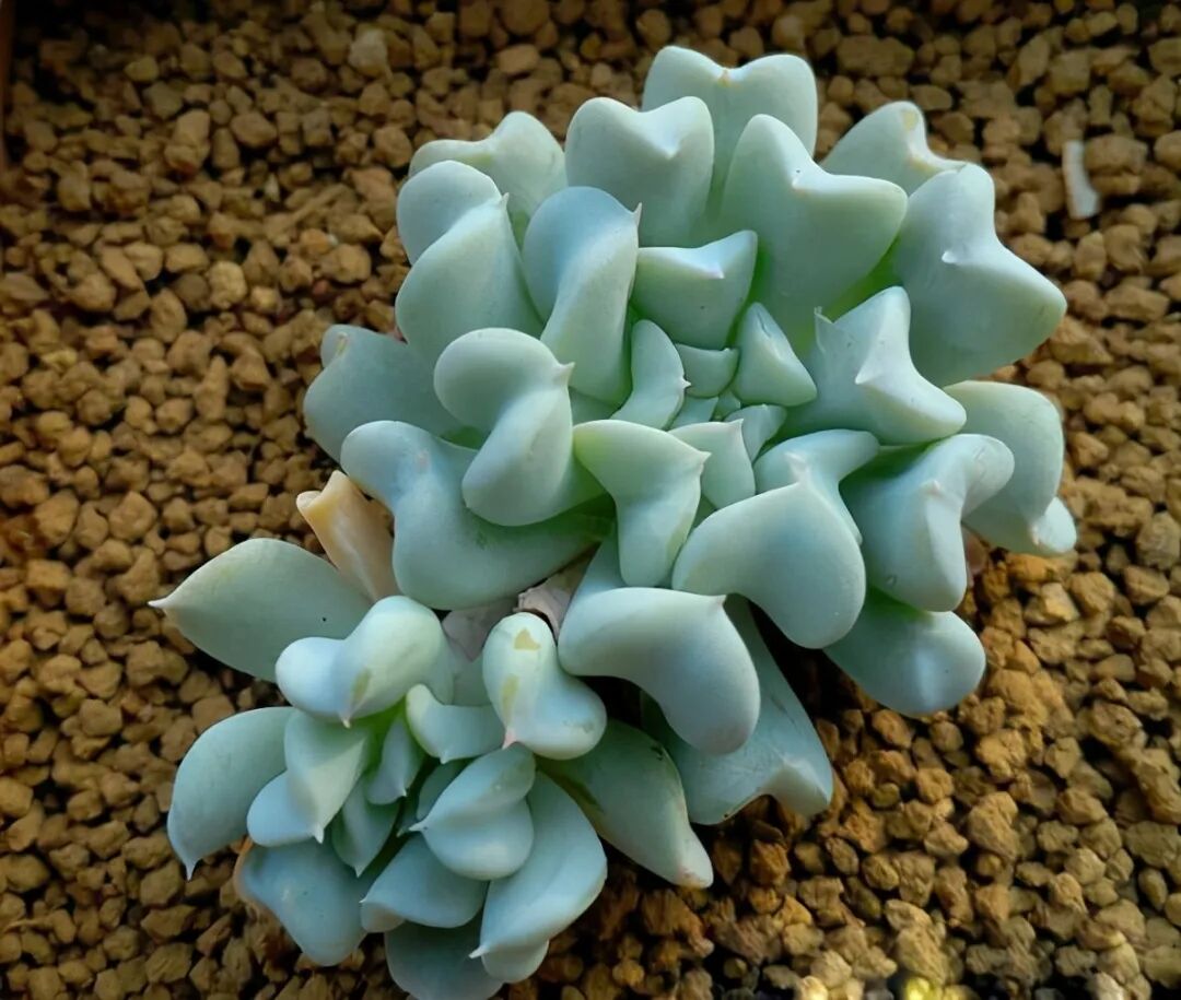 The leaves are spoon-shaped, the leaf margin rolls downward, like a boat-shaped, with thick white powder on the surface, and the leaf margin is light pink due to light. The leaf shape is very peculiar, and the middle part of the leaf tip is obviously wrinkled towards the central growth point.