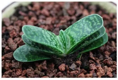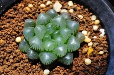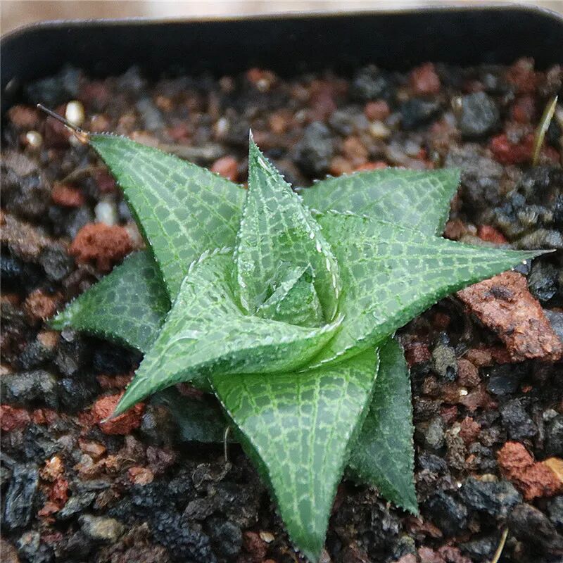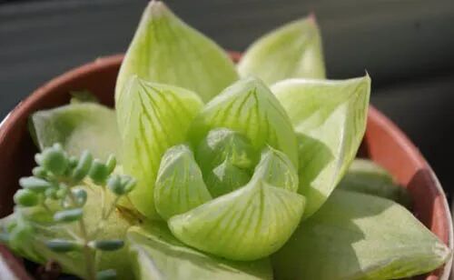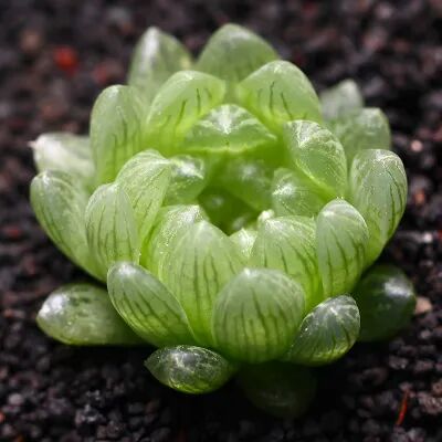 The leaves are thick and full, and the upper half is transparent or translucent, arranged in a compact rosette. The leaves are emerald green, with dark linear veins. Under the condition of sufficient sunshine, the veins are brown, and there are small "whiskers" at the top of the leaves.