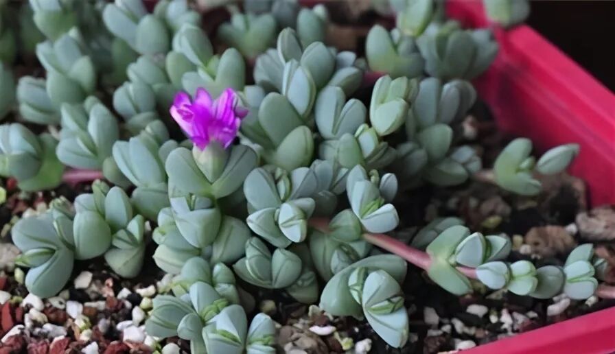 Leaf blade obovate, apex obtuse, opposite, tightly arranged. The leaves are pale green or yellow-green, covered with thick white powder, and the leaf margin is red in full sunshine.