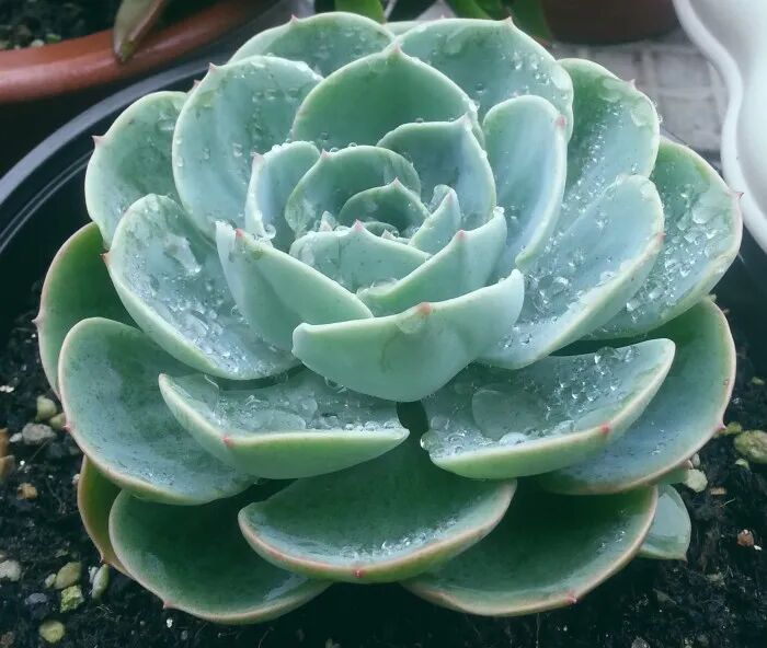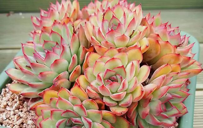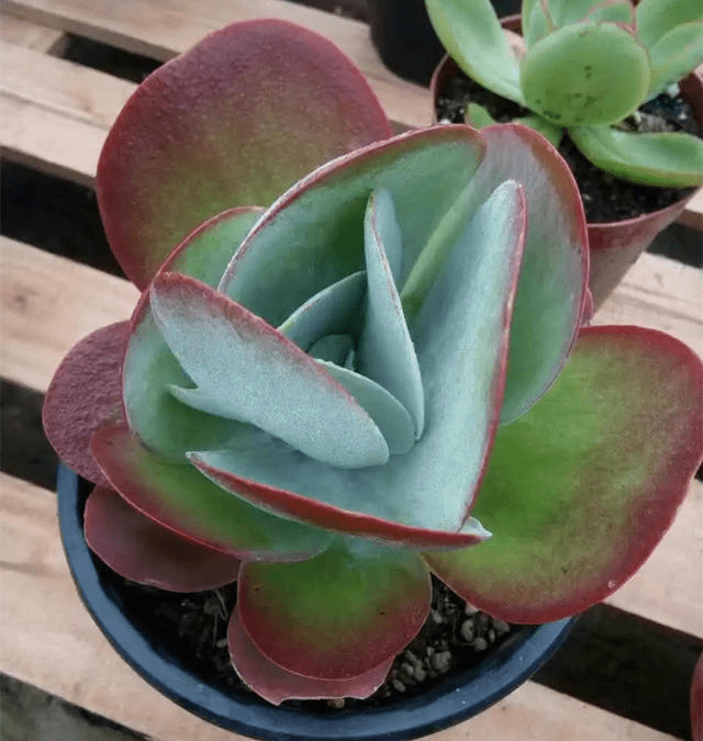 The leaves are spoon-shaped (the upper surface of the leaves is flat or slightly concave, and the lower surface is round and slightly convex), and the enclosure is rosette-shaped. The color of the leaves is light blue-green, with red edges at the tips, which will turn red when there is sufficient sunshine.