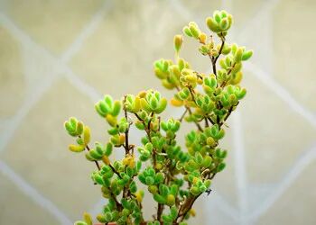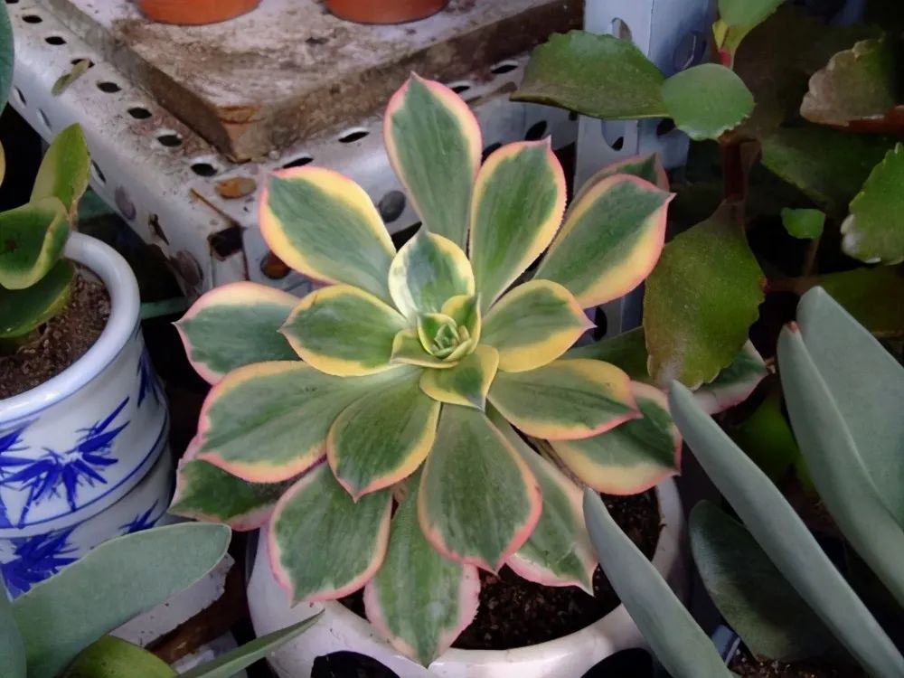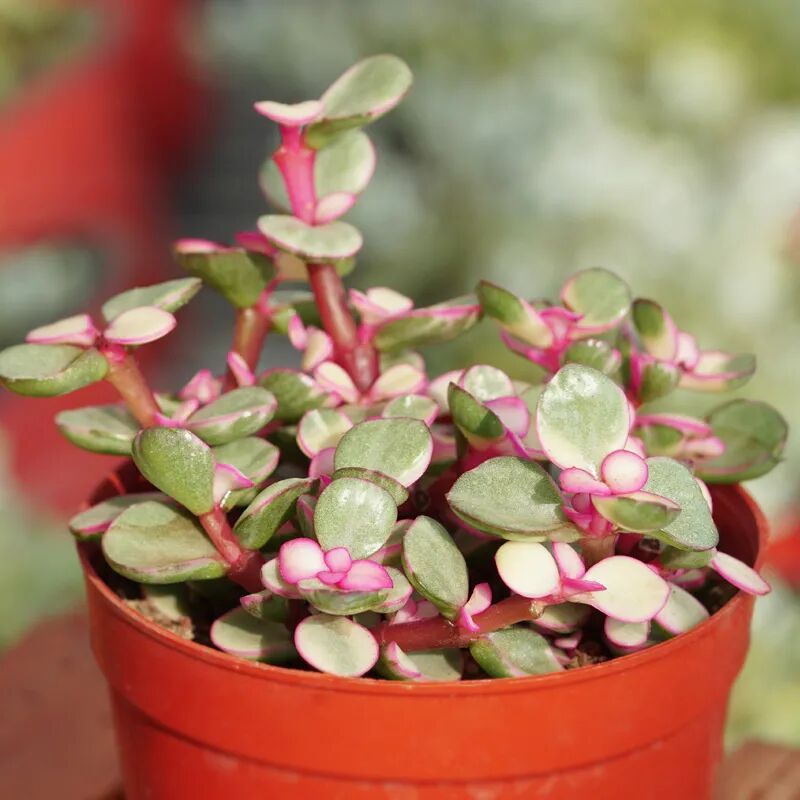 The leaves are obovate, mostly yellowish-white, only a small part of the center is light green, alternately opposite. The plants are shorter, the branches are thinner, and the fleshy stems are reddish brown (new stems) or off-white (old stems). The edges of the small flowers are pale pink.