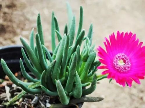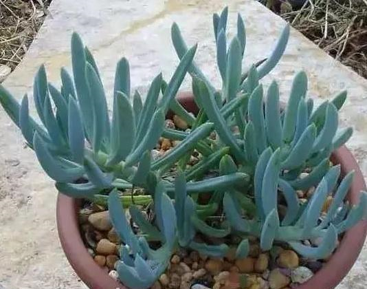 The leaves are fleshy and cylindrical, the surface is flat and slightly curved upward and inward, the top is rounded and blunt, and loosely clustered at the top of the branches. The leaf color is gray-green or light blue-green, with orange or orange-yellow at the apex in full sunny conditions.