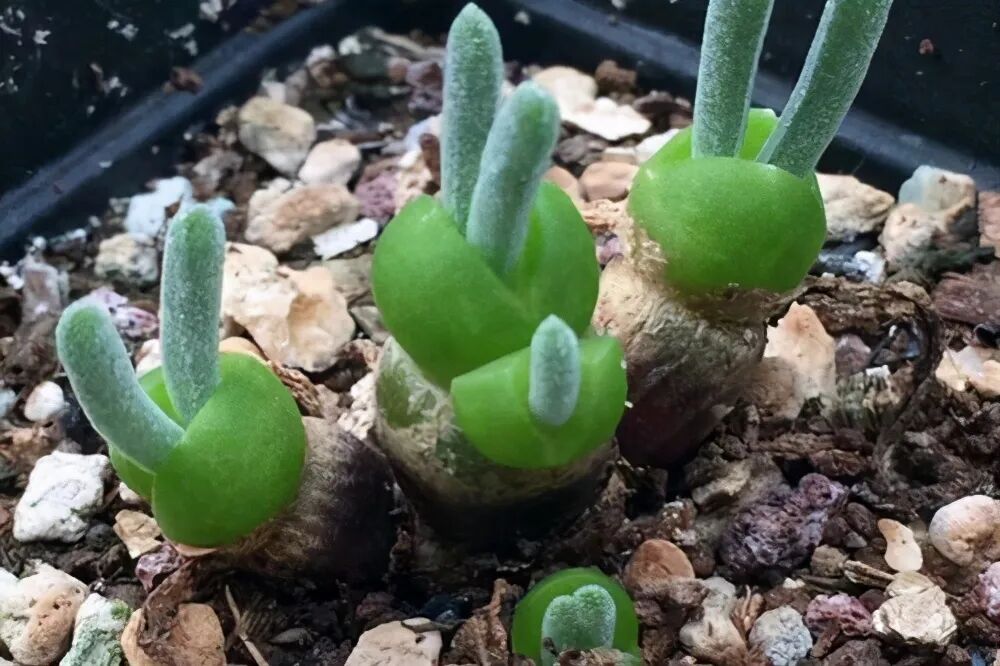 The leaves are fleshy and have two morphologies (the leaves are slender and opposite in the growing period, often unconnected; the leaves are short and thick, hemispherical in the dormant period, and the opposite leaves are highly connected).