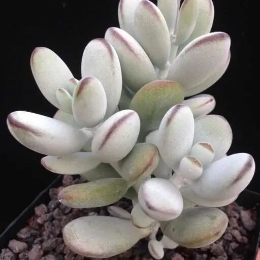 The leaves are thick and fleshy, slightly covered with white powder, and the bases of the leaves are connected together, alternately opposite. There are translucent lines on the leaf margin and back of the leaf. The leaf tips and margins will be slightly purplish in full sun.