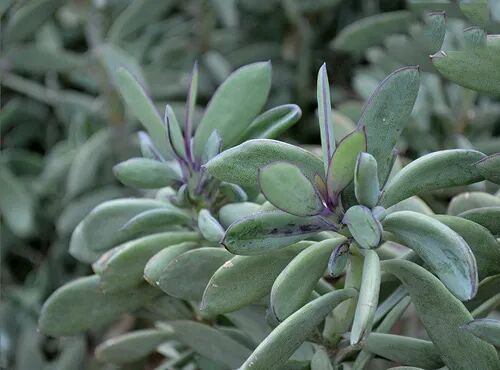 The leaves are short rod-shaped opposite, the leaves are gray-green in color, the surface is covered with white powder, and the periphery of the leaf margin is inlaid with purple-red. The shape of the leaves varies (there are different leaf shapes such as short round and thick square).