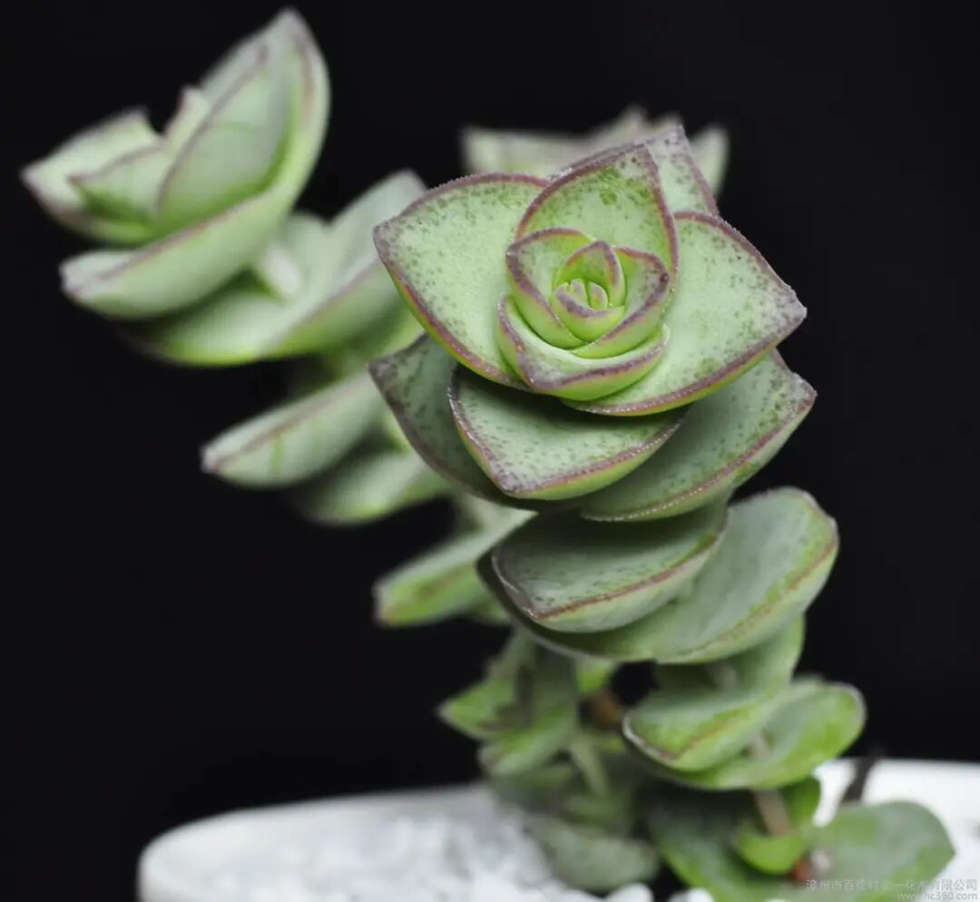 The leaf blade is ovoid, with white frosty powder, the apex has a small tip, and the edge is translucent. The leaves are gray-green, tightly arranged, and the outline is delicate and elegant. In a sunny environment, they will show an elegant lotus color, which is quite like a small rose made of jade.