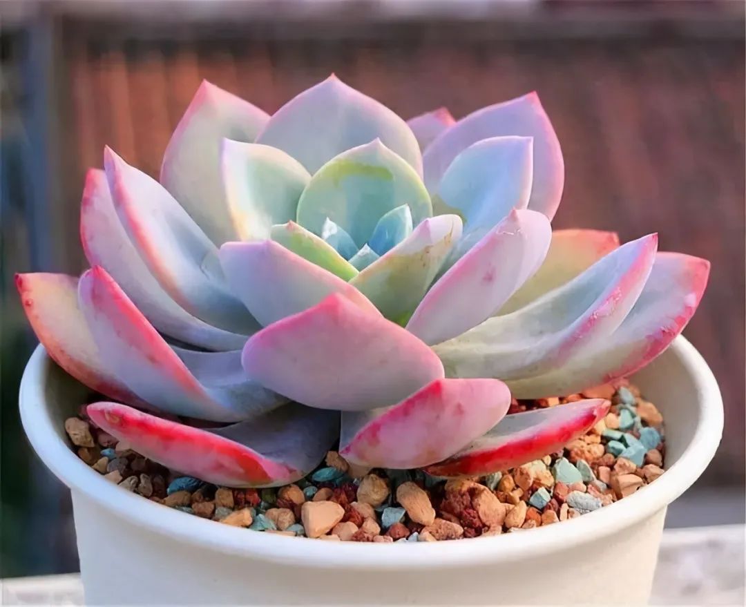The leaves are round, with large wavy folds on the leaf margin, and they are densely arranged in a rosette shape. The color of the leaves is emerald green to reddish brown (the color changes from blue-purple to orange-red with the change of light), the leaf margin often appears pink, the leaf surface has slightly white powder, and the white powder of the old leaves is smooth after falling.