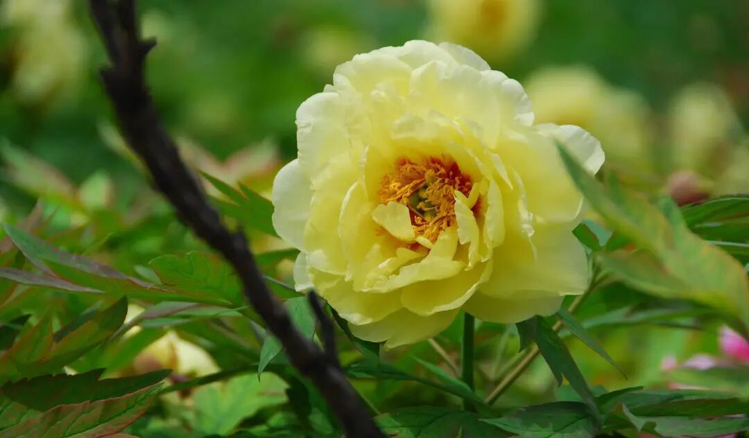 Yuyihuang flowers are lotus or chrysanthemum-shaped, with wide and wavy petals. The flower color is light yellow, the stamens are golden yellow, and the flower diameter is about 15 cm. It is a traditional yellow peony variety.