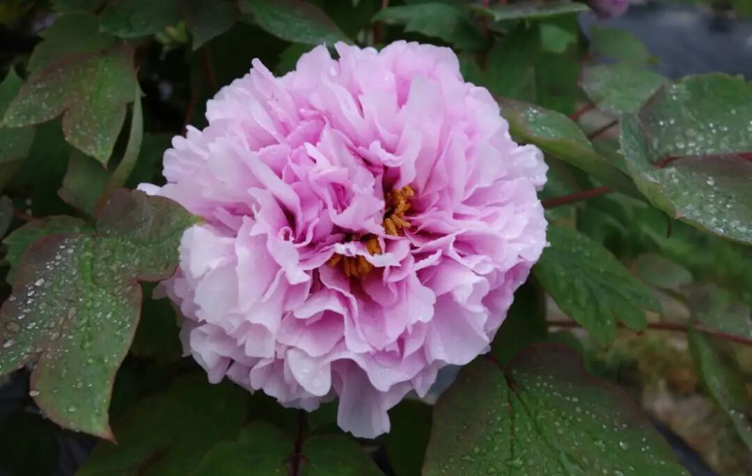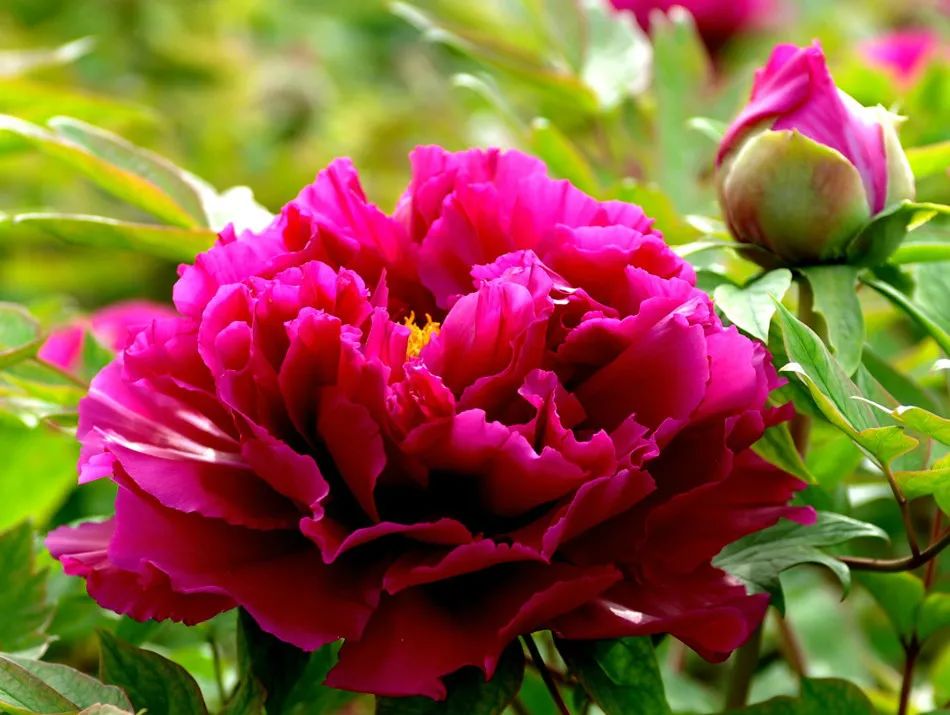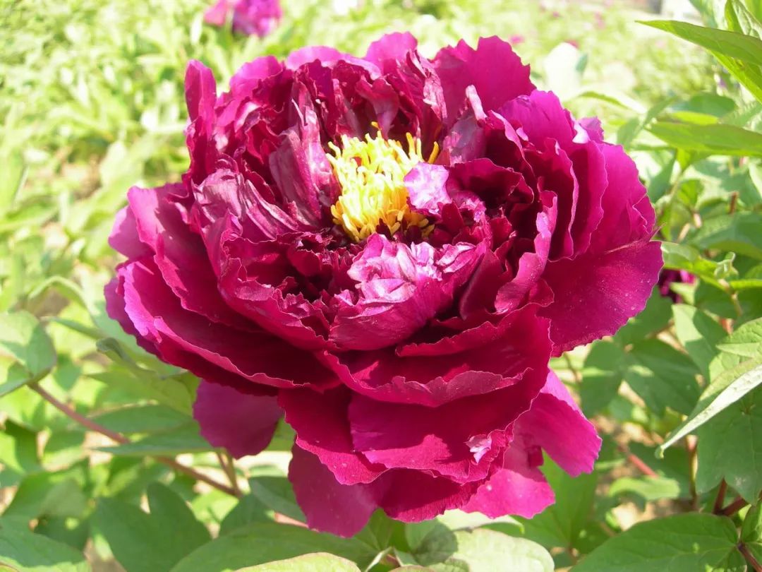 Luoyang red plants are tall, the flowers are rose-shaped, the buds are round and pointed, the petals are multi-round and hard, neatly arranged, with ink purple spots at the base, some stamens often have petals, and the pistils are many and small. The petals are purple-red, shiny, and the flower diameter is about 17 cm. It is the only peony variety named after Luoyang.