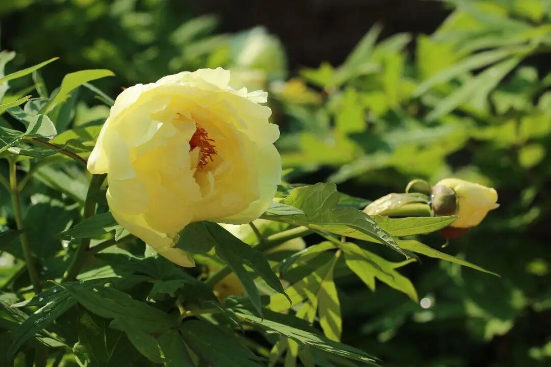 Yaohuang plants are up to 200 cm tall and have crown-shaped flowers (sometimes golden ring-shaped). The flower buds are round and pointed, often dehiscent at the ends, with 3-4 rounds of outer petals, hard texture and purple spots at the base; The inner petals are tightly folded, anthers often remain at the petal ends, and the pistils are degenerated or petalized. The flower diameter is about 16 cm, light yellow flower color, It is one of the four famous peony products.