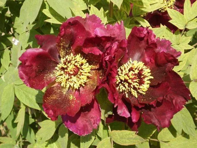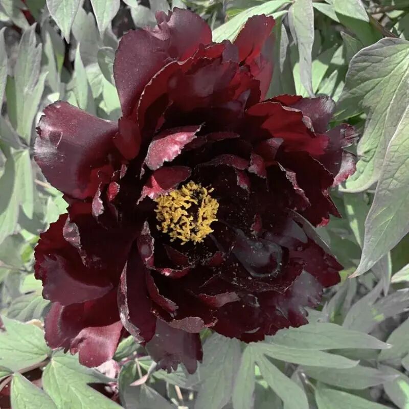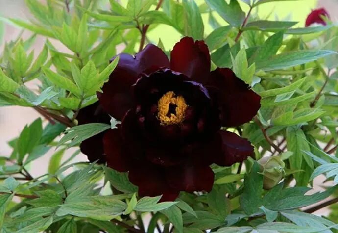 Genus Thousand Floor platform pavilion type peony , Inky purple flower color ( Near black ) , petals Flap fragmentation And Soft, Like shearing velvet, so Get Name.