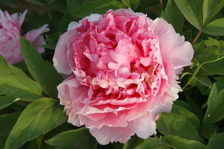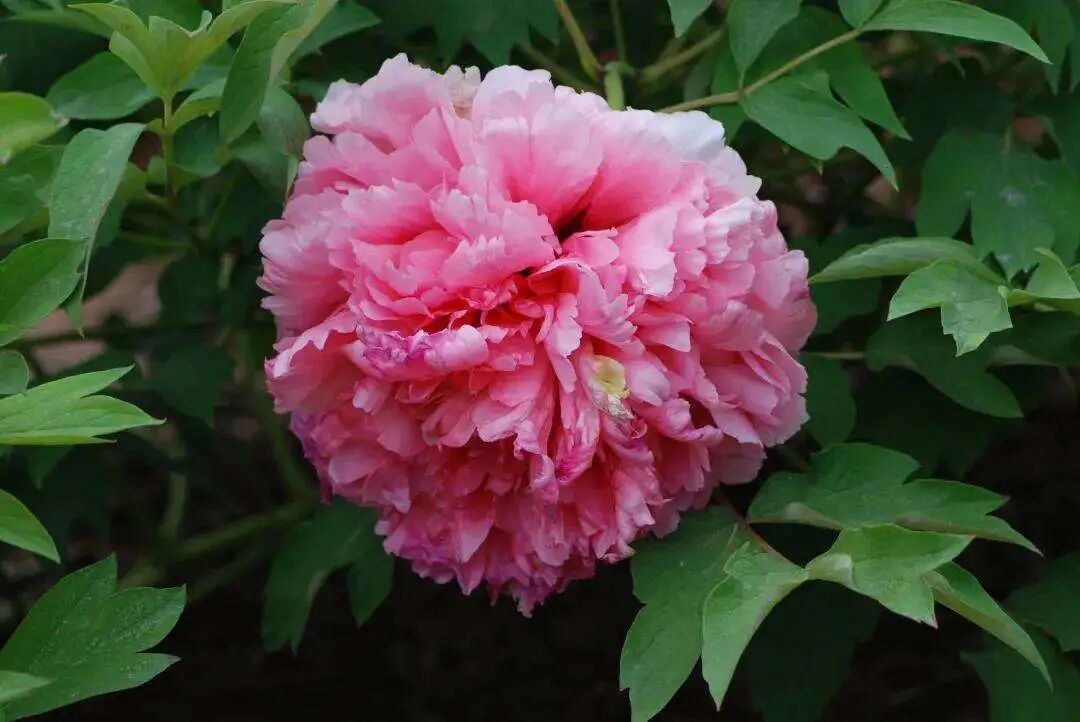 Genus Crown peony , Pink flower color ( Middle lower Slightly deeper ) , External valve shape large ; The inner petals are wrinkled, compact, towering and plump as a ball, and the pistil petals turn into yellow-green colored petals.
