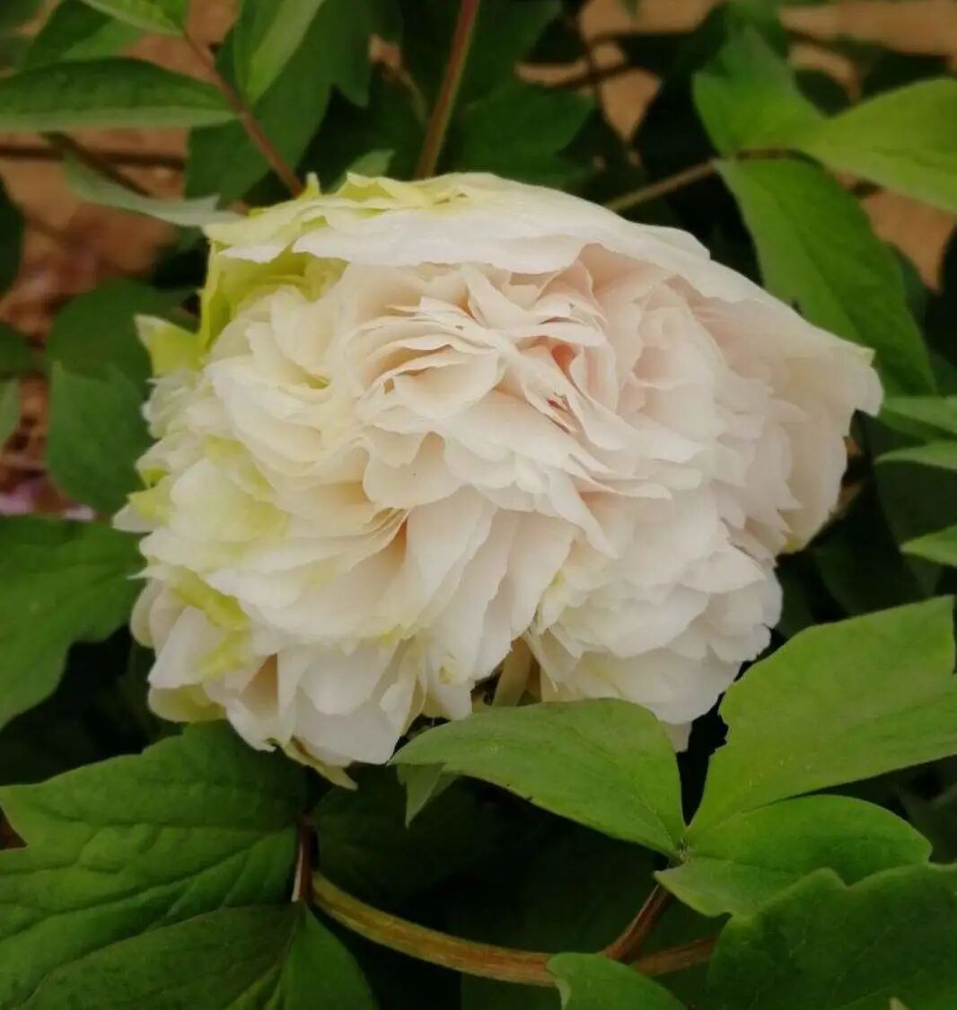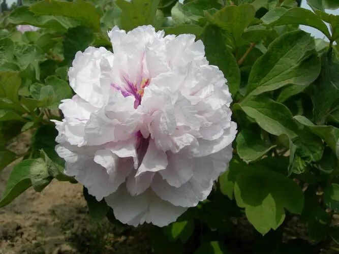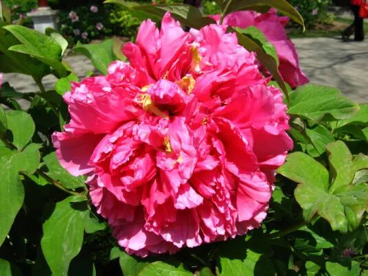 Genus embroider Spherical peony , Fuchsia flower color , Outer petals rounded, textured Thick and hard, with inconspicuous small purple-red spots at the base ; The inner petals are dense and folded, almost all stamens are petaled, with a small amount of residue near the heart, and the pistil is normal and occasionally petaled.