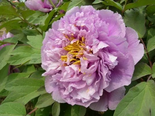 Genus emperor Crown peony , Pink flower Color, the outer petals are large and flat, the base is dark, and the texture is soft; The inner valves are narrow and dense, curled centripetally, with one clamped in the center of each inner valve Dao Purple Fine lines 。 Stamens few, sandwiched between petals or at the center of flowers, pistil petals become long and narrow Turquoise Color petals.