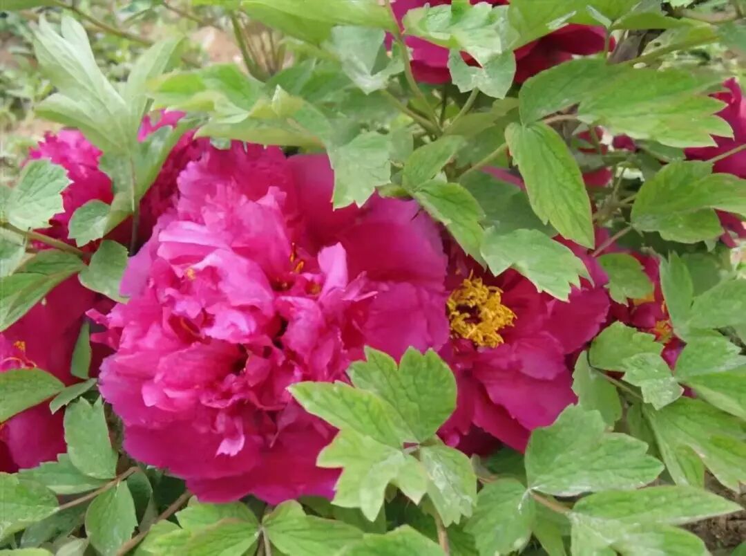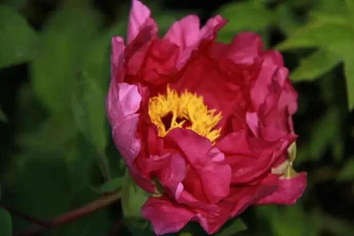 Genus Crown peony , Fuchsia flower color Glossy, base With a black and purple halo, Outer wheel petals Texture Hard, internal valve Neat and tight, often clamped There are stamens, pistils degenerate or petaled and green petals.