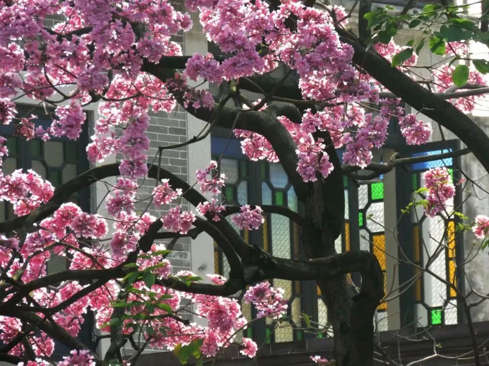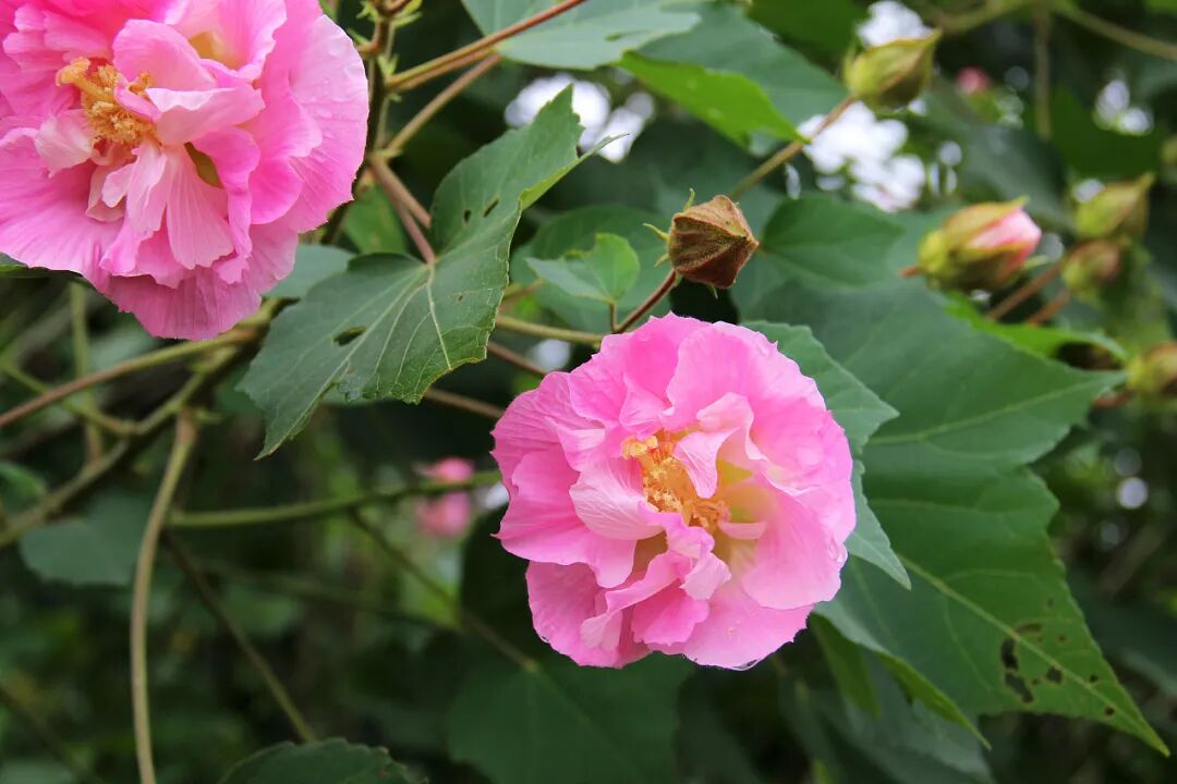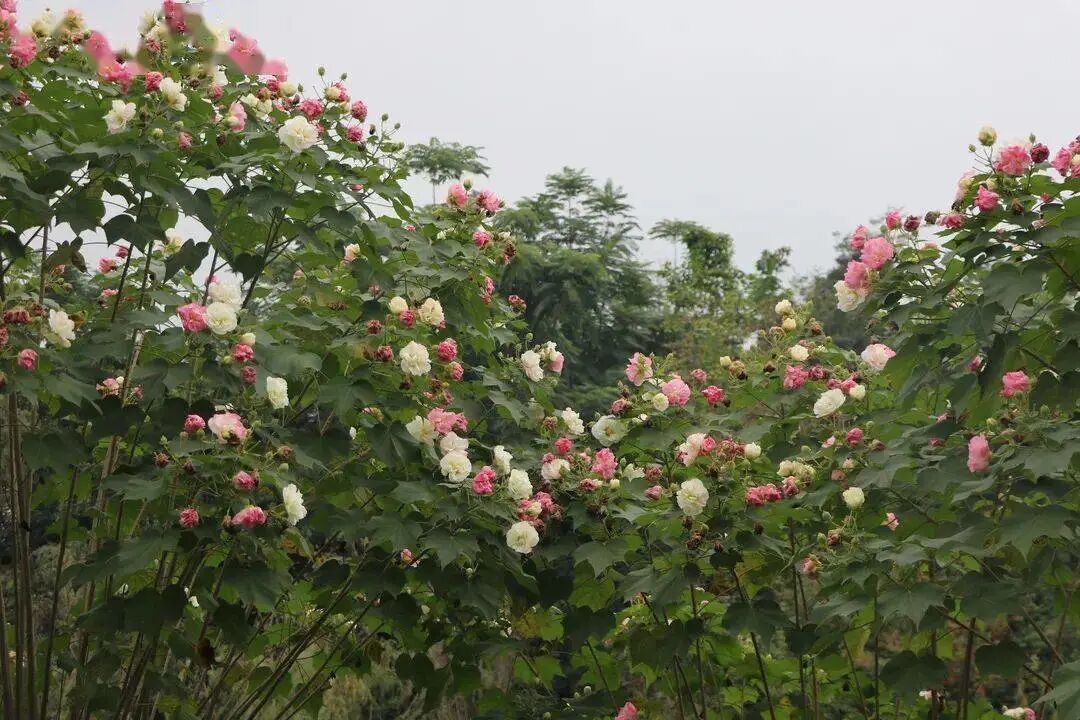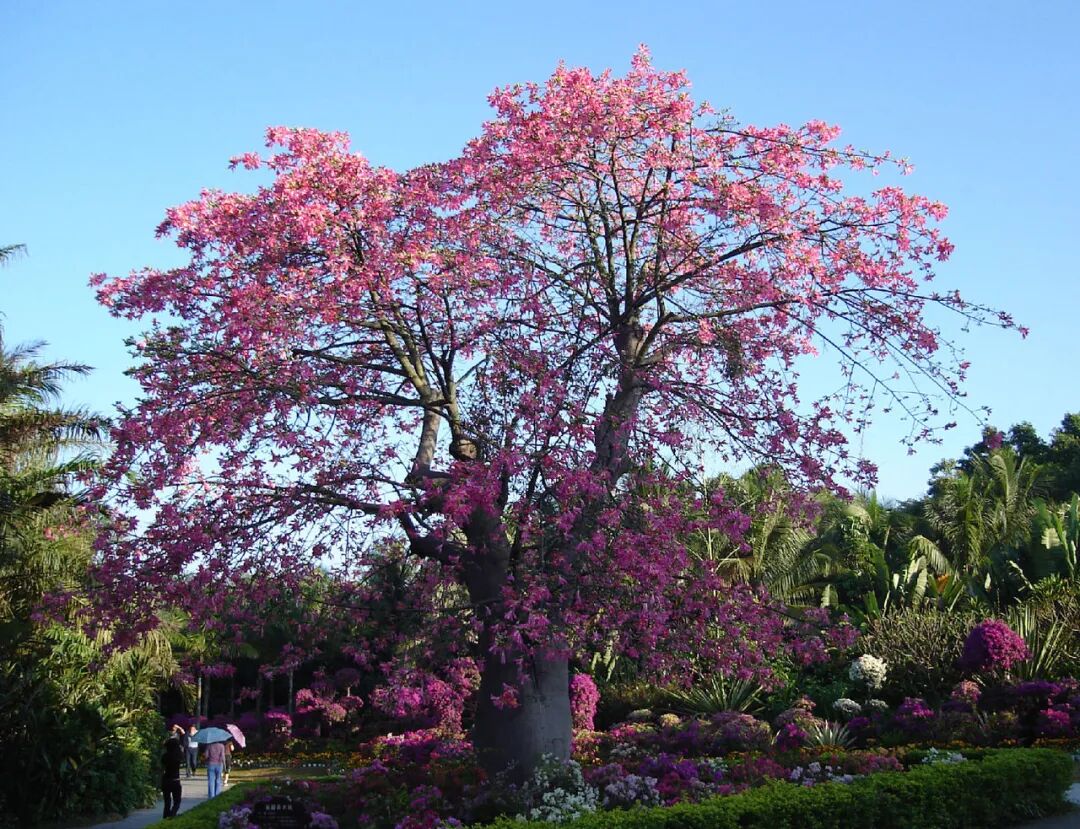 Deciduous tree, 12-18 m tall. The flowers are large, with 1-3 axillary branches (slightly floral), pink or red flower color, yellow or white with purple spots at the base (also all white with yellow inside), and the petals are wavy and slightly reversed at the edge, with a long style. Beauty trees like light, high temperature and humidity, slightly tolerant of shade, slightly tolerant of drought and barren, and not tolerant of waterlogging.