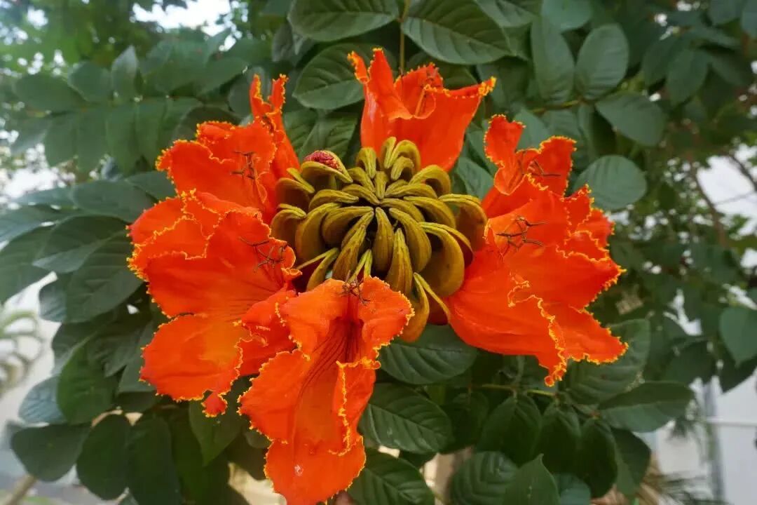Tree, 10 meters high, terminal corymbal raceme (inflorescence axis is 12 cm long), dense flowers, long style, one side of corolla swollen (unequal size), broad oval, with longitudinal pleats, flower color orange-red outside, orange-yellow inside, protruding stripes inside, very gorgeous. Flame trees like high temperatures (grow faster in sunny environments), like water, and are not cold-tolerant.
