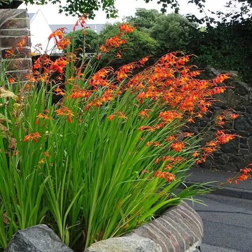 Perennial herbaceous plant with bulbs (oblate with brown fibrous membrane outside) and stolons. The bulbs resemble water chestnuts. The leaves are linear sword-shaped, the flowers are funnel-shaped, orange-red, and the horticultural varieties are red, orange and yellow, arranged into complex panicles, drawn from the lush green leaves, with scattered heights and uniform density.