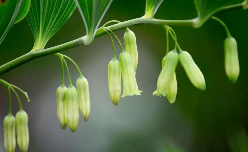During the blooming season, three green and white "little bells" can grow under almost every leaf of Polygonatum odoratum, so cute!
