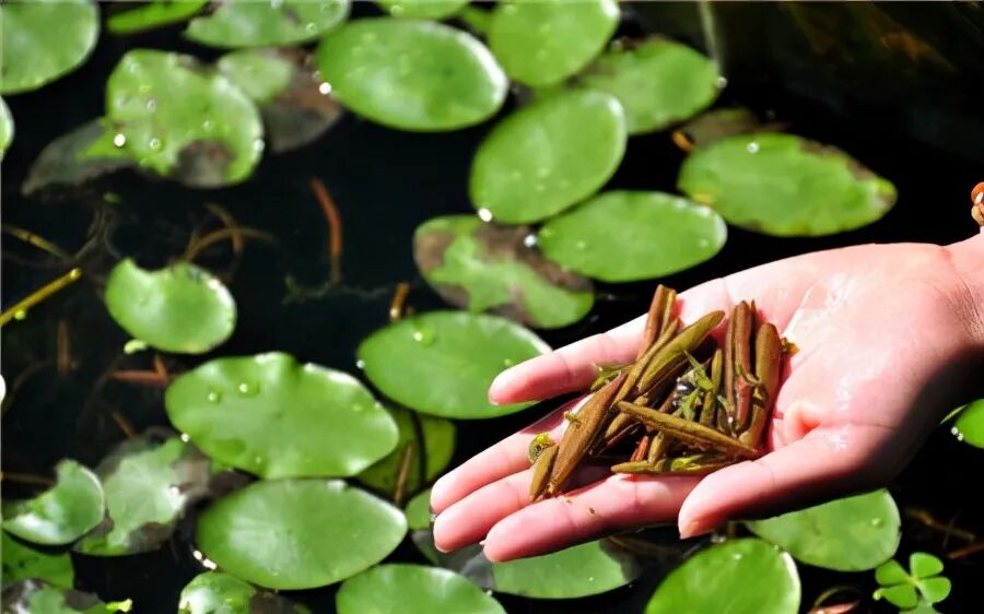Water shield is an aquatic plant, a bit like a small water lily, The young leaves are very delicious for stir-frying or soup Since ancient times, there has been a delicious dish of water shield and sea bass soup. Water shield curls in the soup, like fresh green tea, so it is also called "Biluochun" in the soup.
