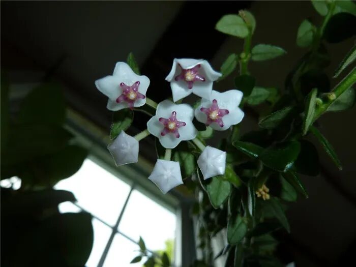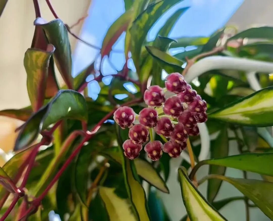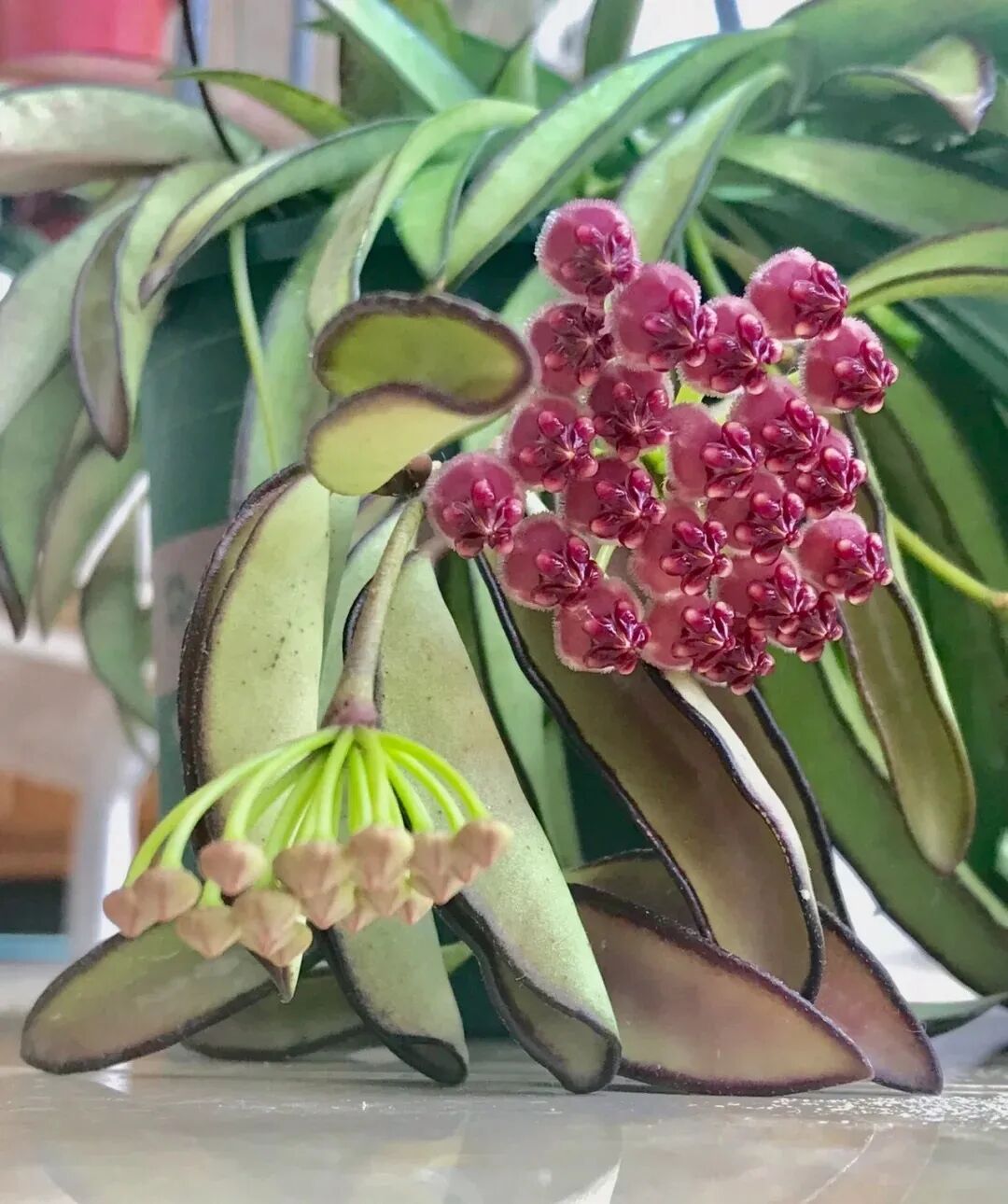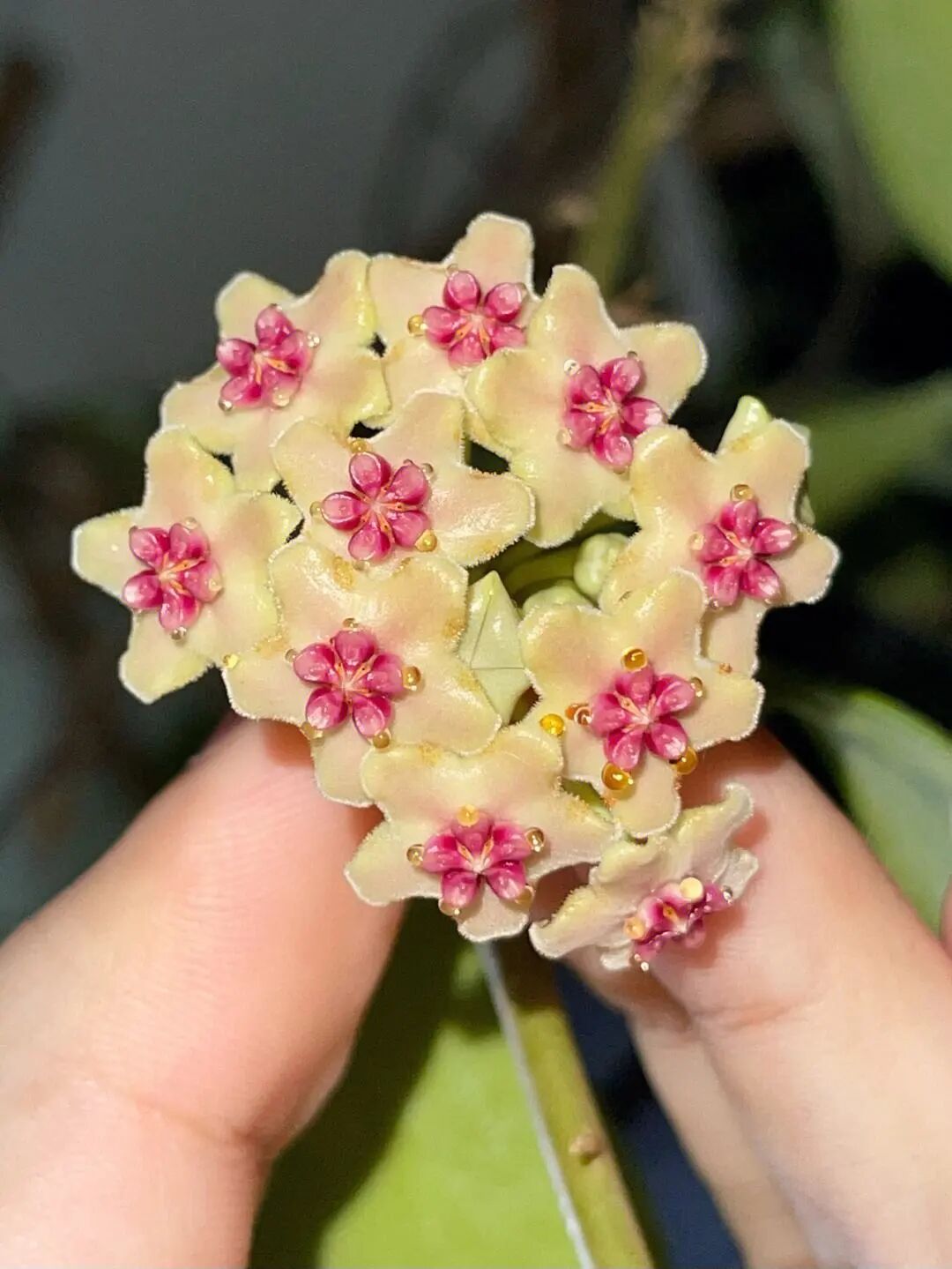 Of Hoya varinensis The leaves are long ovate, usually green ( In autumn and winter, when there is plenty of sunshine, maple leaves will turn red ), corolla white (flipped backwards), secondary corolla pink; Flowers emanate Sweet aroma similar to brown sugar + fruit.