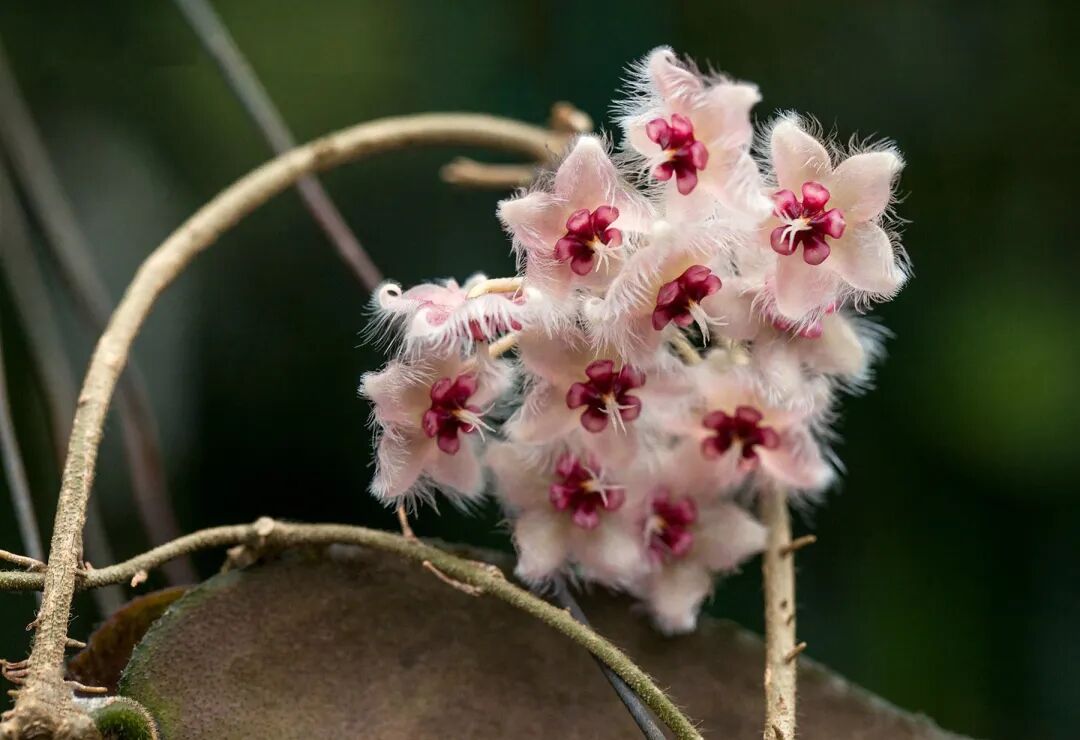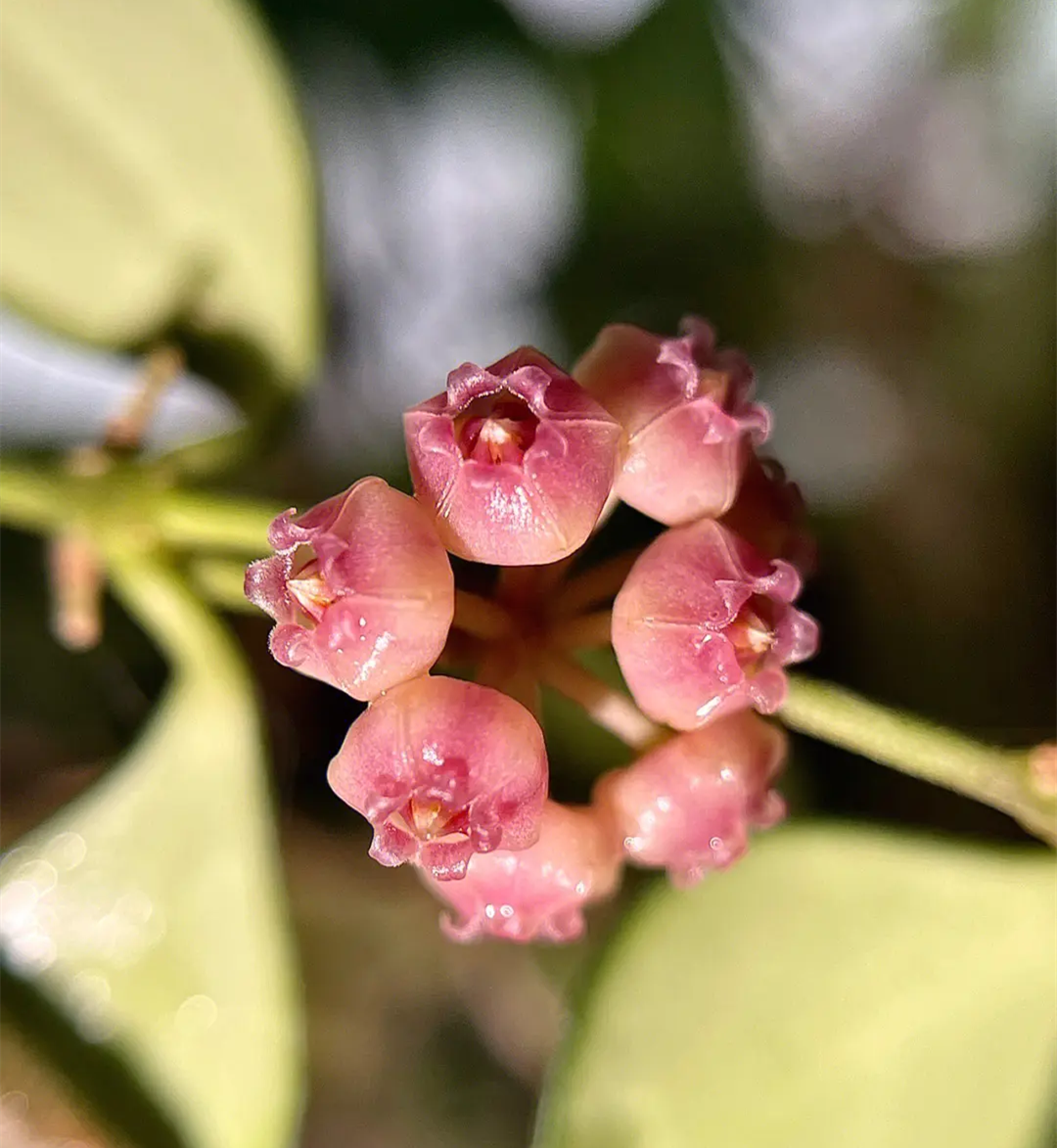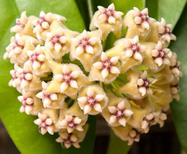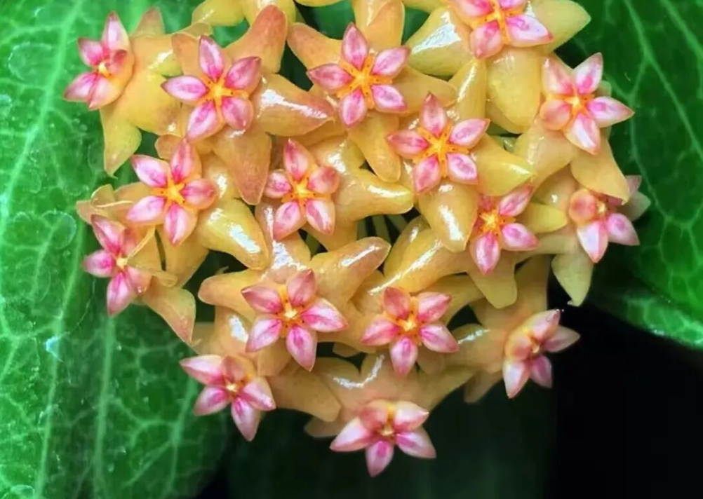 Hoya caudate is also known as "Bronze Hoya", The leaves are oval, and the surface of the leaves is often covered with white lumps of powder; Corolla yellow or pink, with distinct fine hairs on the margin, subcorolla pink (center red) 。