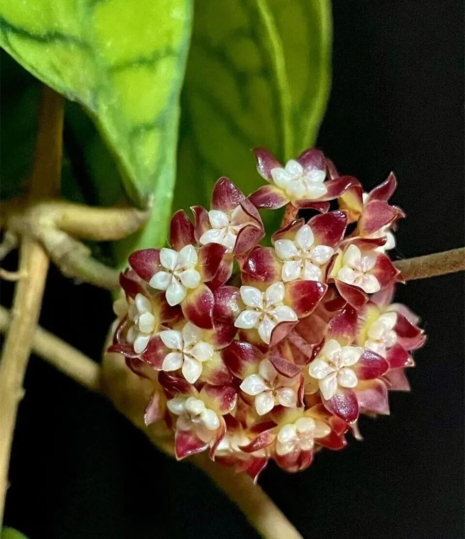 Light hoya orchid is also known as "watermelon peel hoya orchid", Its leaves are large and oblong, and the leaf surface has a texture similar to watermelon rind; corolla Brownish red (base yellowing) , the corolla is white, the whole flower is crystal clear, exuding a faint caramel smell.