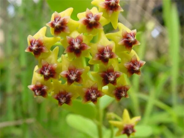 The leaves of Hoya braxiana are more Thin, oblong to sword-shaped, with rough leaf surface; The corolla is bright yellow and inverted cup-shaped, and the secondary corolla is also bright yellow; The flowering period of Bulaxuan Hoya is very long (Flowers almost all year round) , but no floral fragrance.