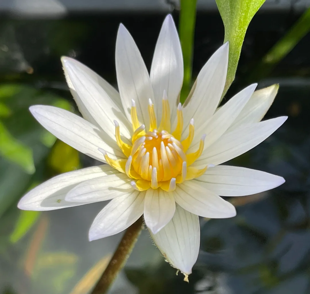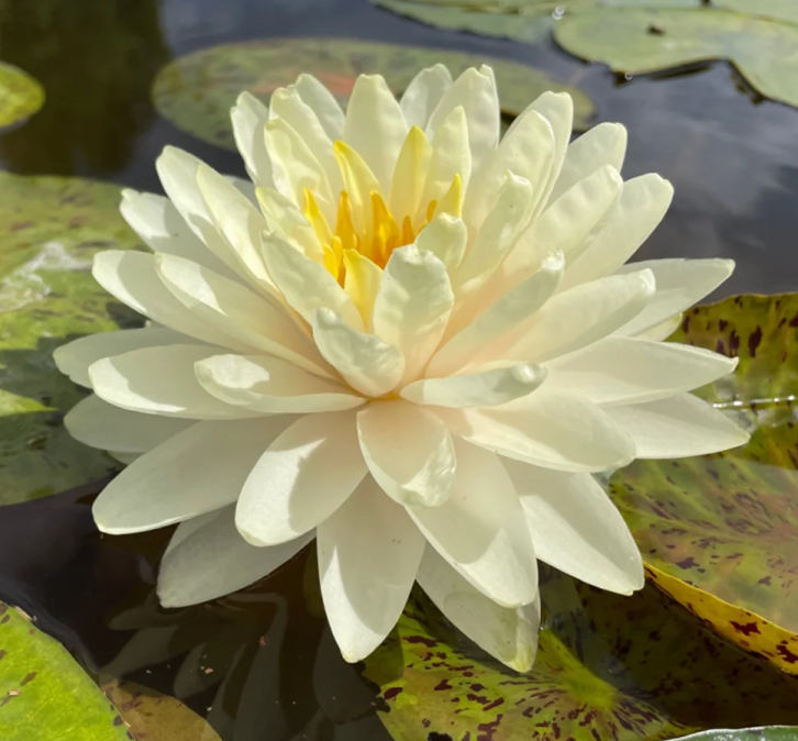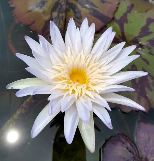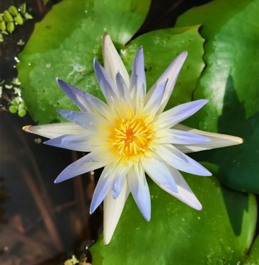 Dobei belongs to small and medium-sized tropical water lily varieties, The soft white flowers have a blue smudge on the top and golden yellow stamens. Rich floral fragrance and long flowering period ( Can bloom in shade until late autumn ) 。