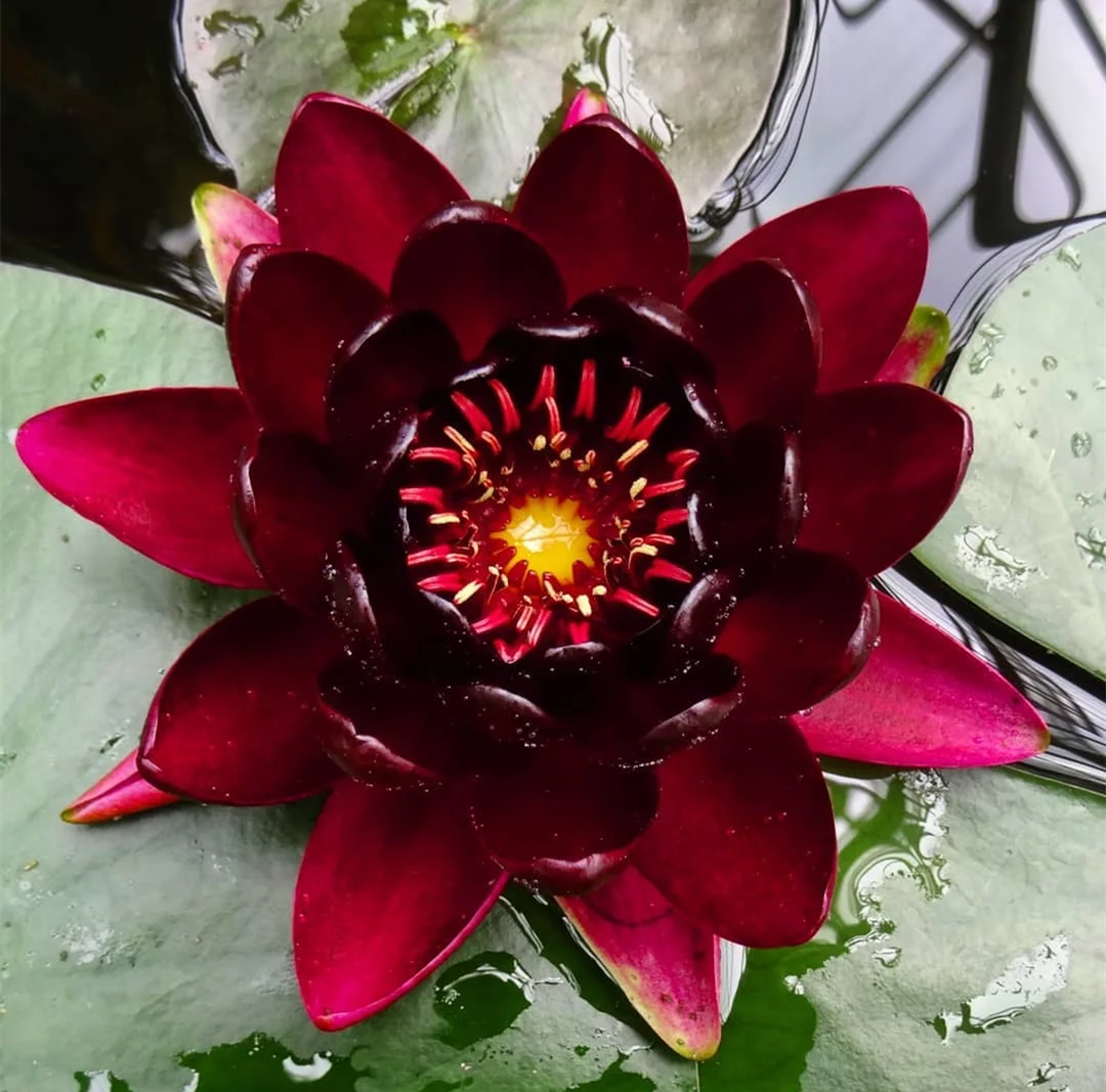 Black Princess It is a small, hardy water lily variety with waxy petals and a rich deep red color ( Outer petals red, inner petals almost black ) , slightly fragrant; The newly born leaves show a purple-red tone, and when mature, they turn green.