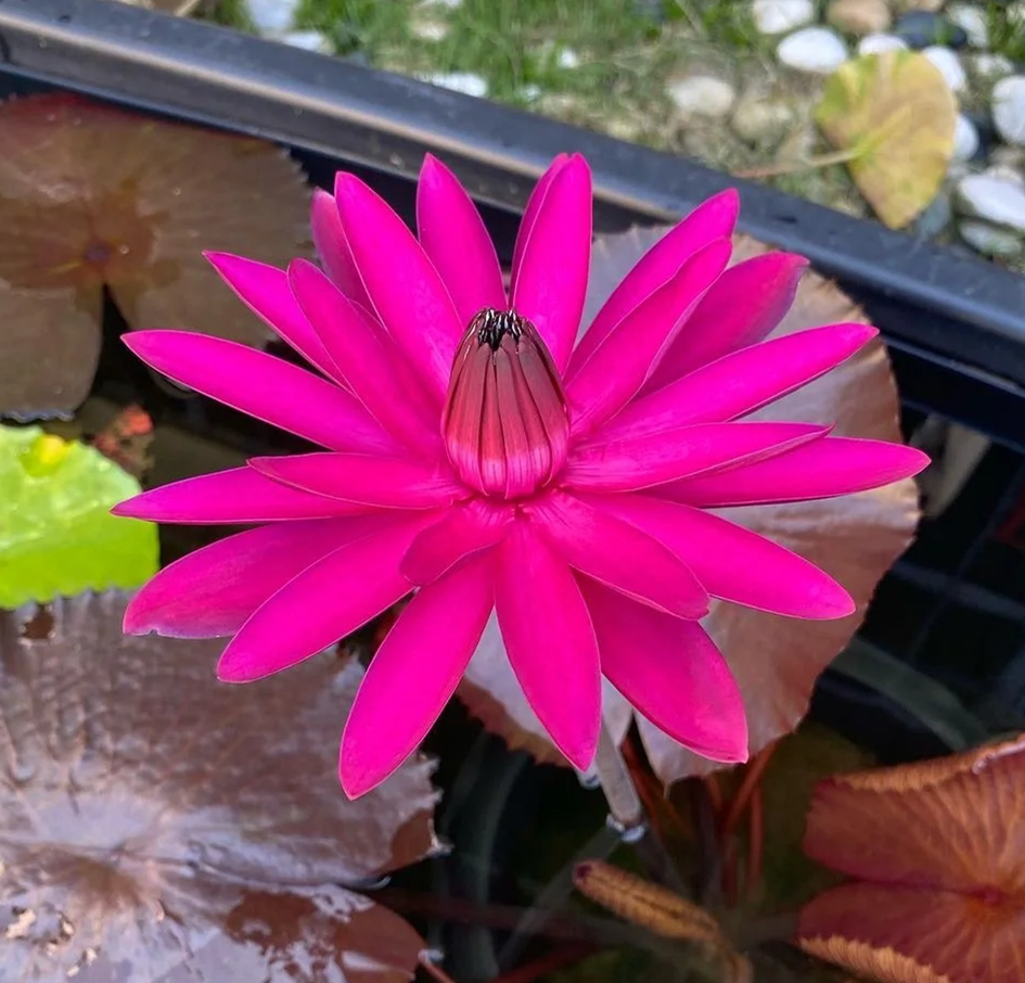 Carla Sunshine Belongs to medium tropical water lily and is the only viviparous yellow water lily variety on the market at present, Flowers and leaves have ornamental value: Dark yellow flowers, pure and flawless, with brown variegated leaves.
