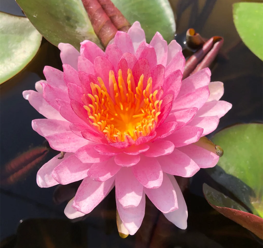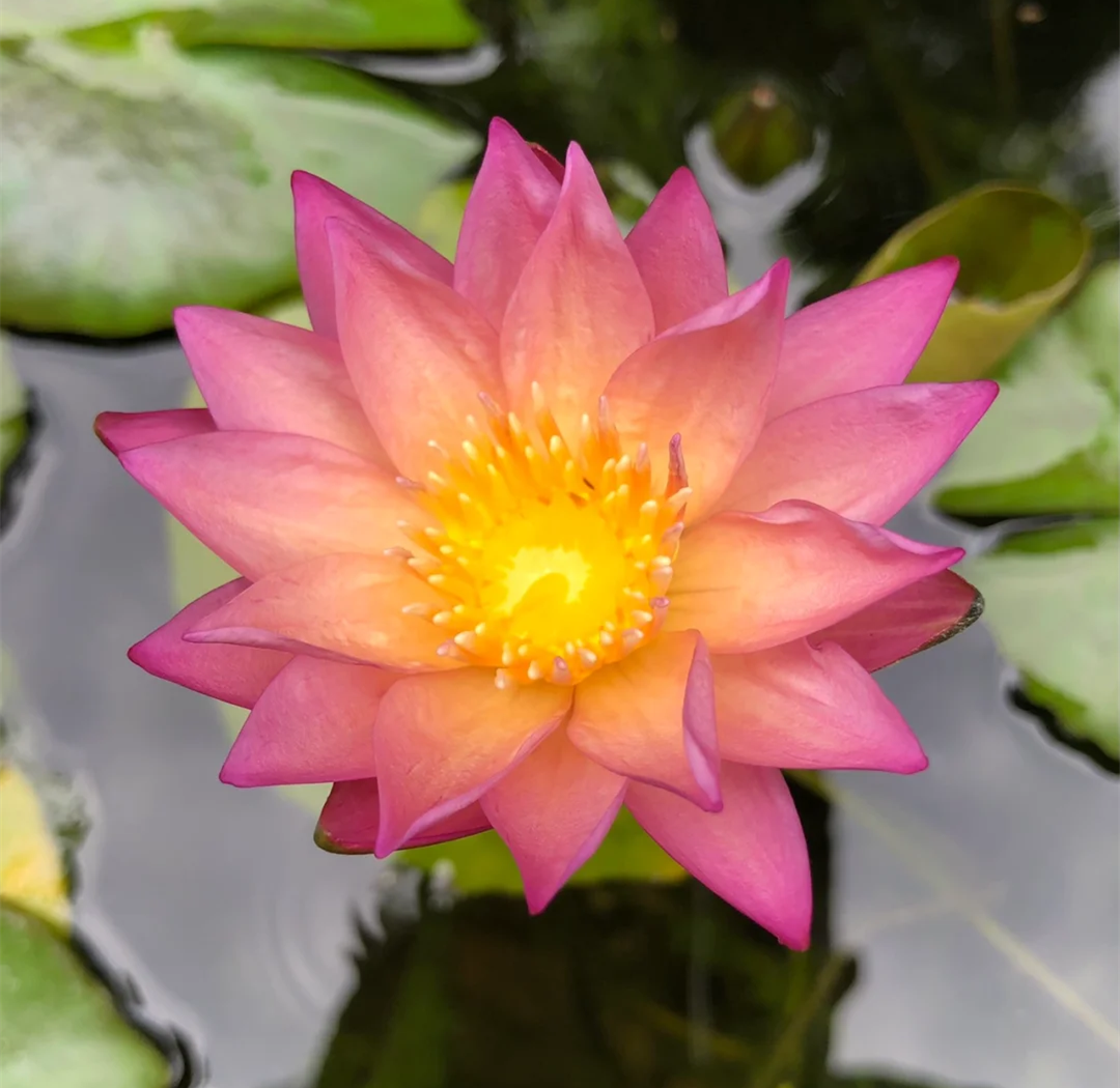 Tropical sunset Belongs to medium-sized tropical water lily variety, The flower color is pink-yellow, abundant and vigorous.