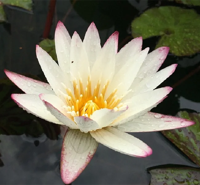 Innocence belongs to the medium-sized water lily variety, Flowers and leaves have ornamental value: The flower is pure white at first, and the tip of the petals will turn pink at the later stage, and the flowers will be fragrant Rich , has a certain negative tolerance; Green leaves with beautiful maroon markings.