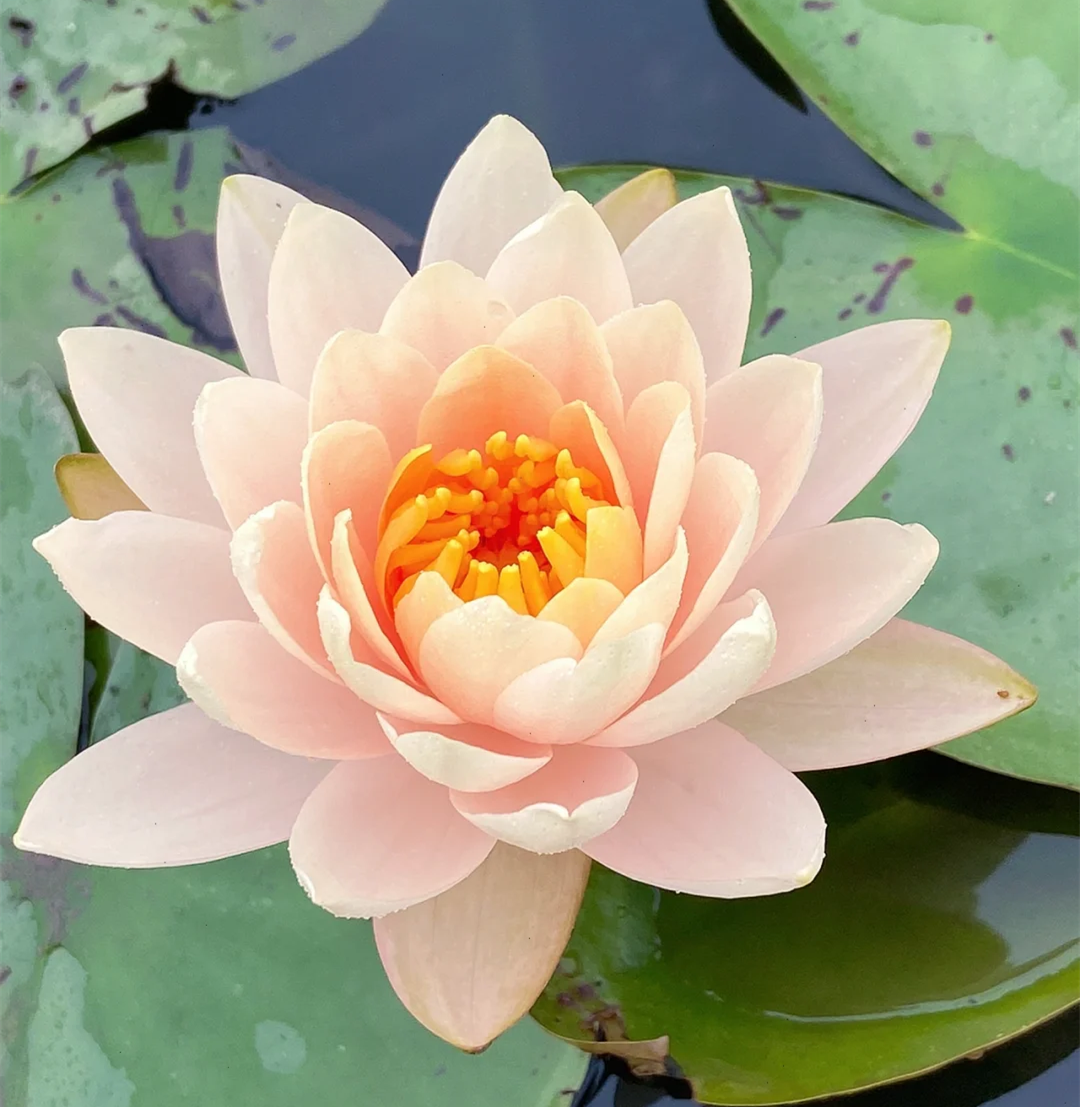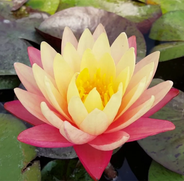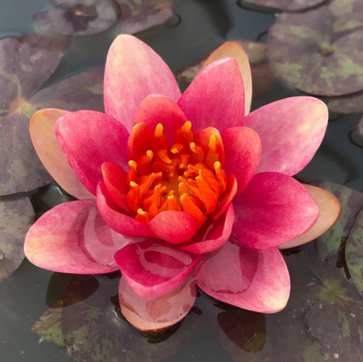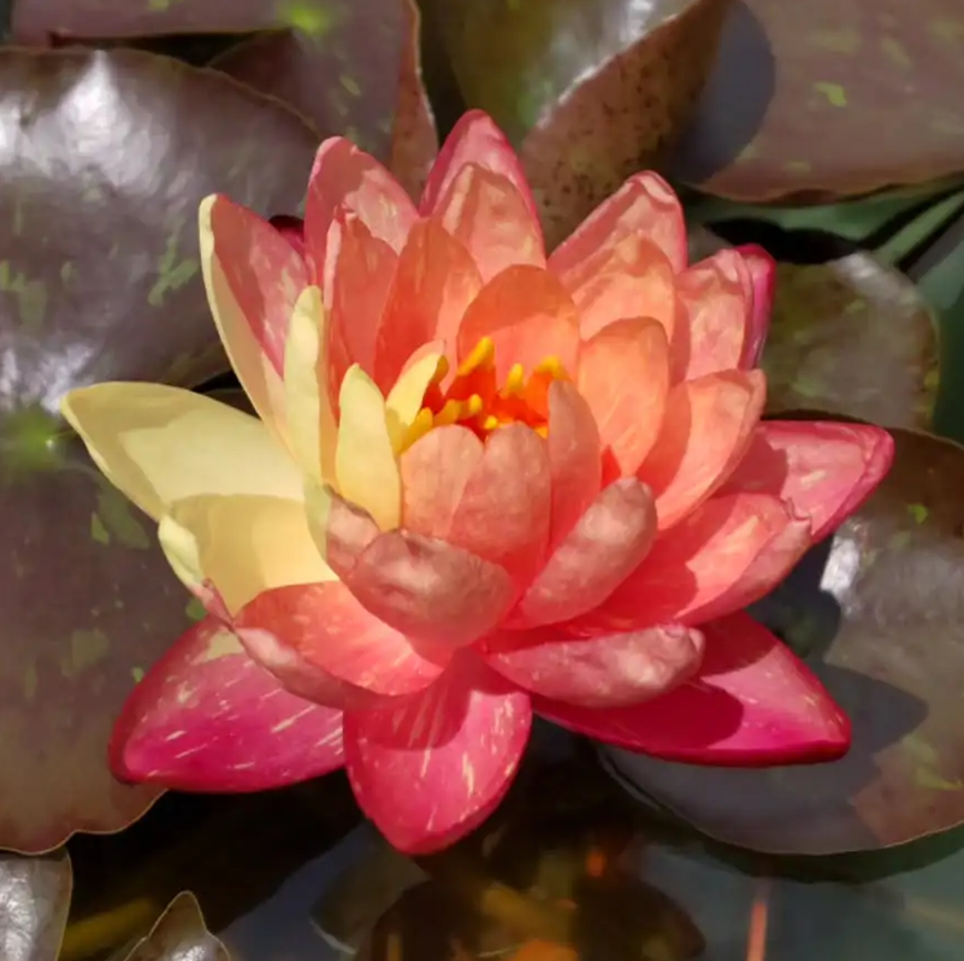 Indiana It is a small color-changing water lily variety with changeable colors, Flowers and leaves have ornamental value: Cup-shaped flower, round petals, flower color It blooms orange-red at first, and turns apricot with time ( Sometimes blending of color emlays occurs ) , the leaves are a random combination of green and burgundy, and the colors are gorgeous.