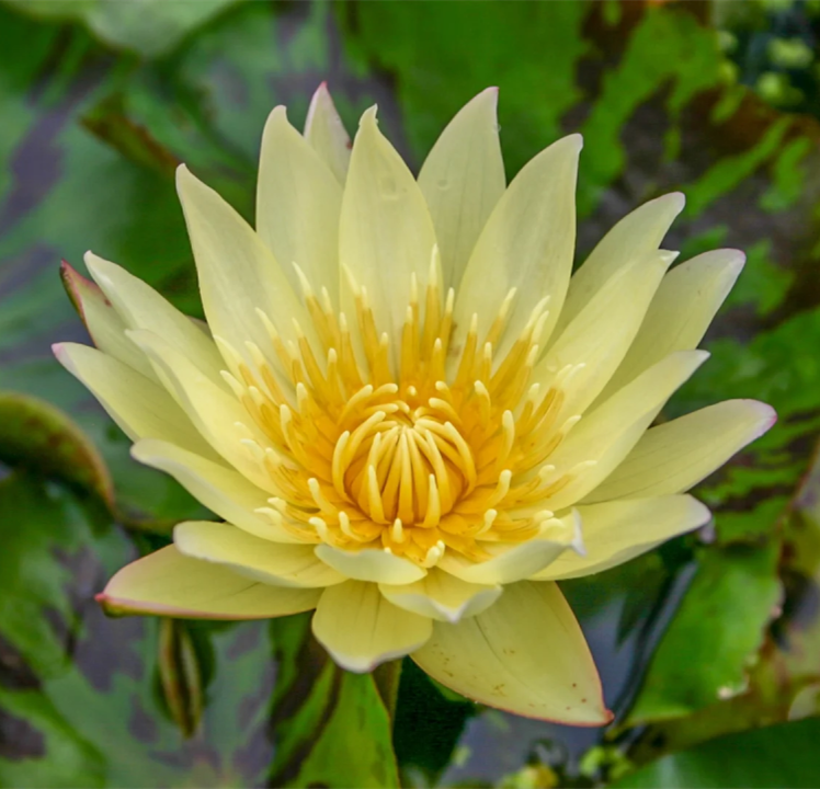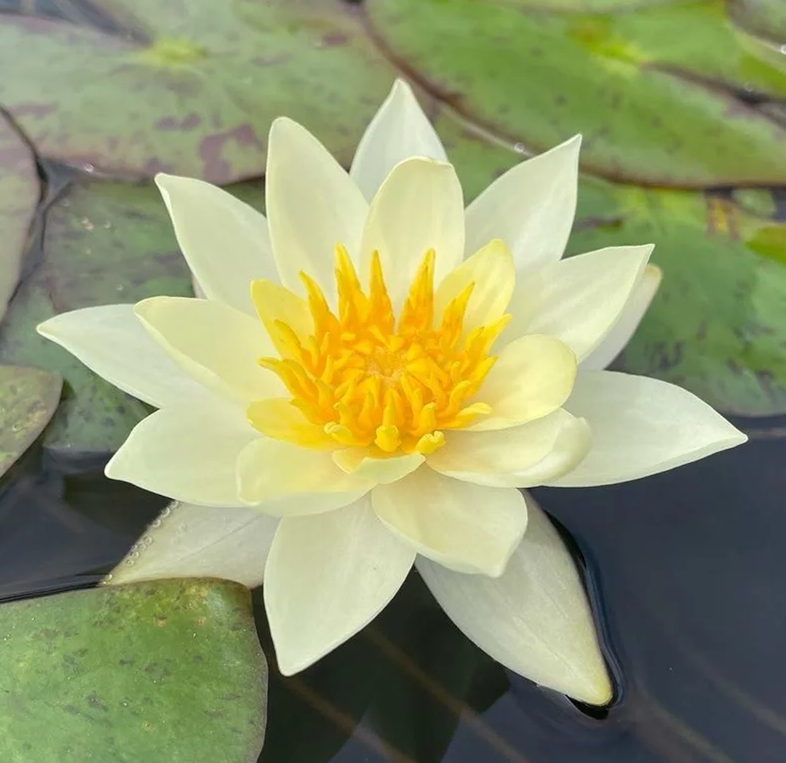 Helfra It is the descendant of the small white meridian and the Mexican yellow lotus, It is the most classic and widely known miniature cold-tolerant water lily variety. Both flowers and leaves are of ornamental value: the flower color is goose yellow, and the tiny olive-green leaves have purple and brown markings.