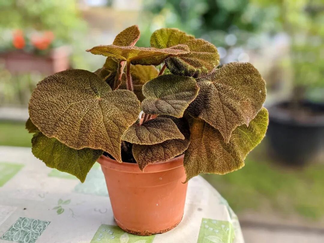 Chocolate River Begonia's The leaves are large and thick, It has a spiral round shape, Surface fluff (Feels like a soft blanket) , Presents different colors at different stages (The yellow-green color of new leaves gradually transitions to dark brown to black) , the stem is also brown-black.