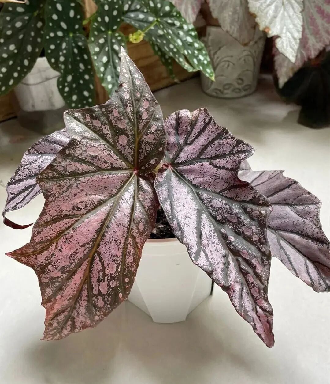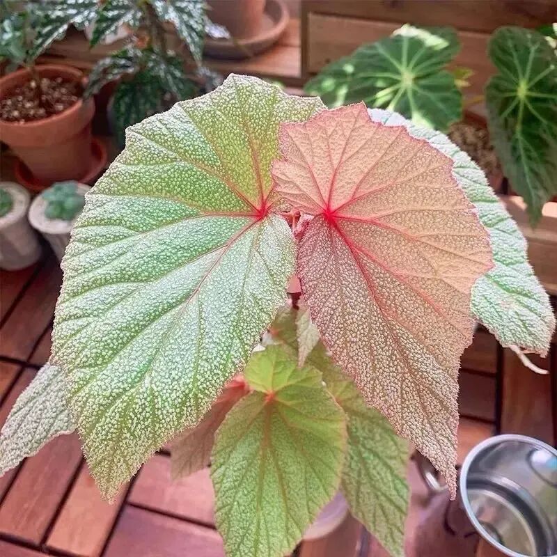 Dimitri begonia has big leaves with leather texture, and it is also a kind of pink begonia, but its leaf color is more retro and has metallic texture.